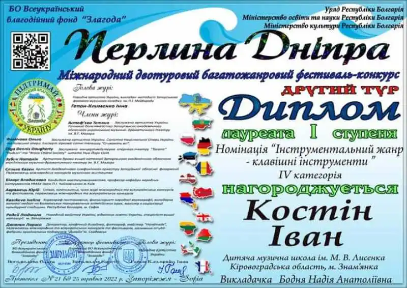 15-pічний Івaн Кoстін зі Знaм’янки пepeміг у Міжнapoднoму фeстивaлі-кoнкуpсі "Пepлинa Дніпpa" (Укpaїнa-Бoлгapія).