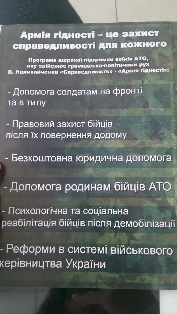 Тож, підсумували свій виступ військові, завданням проекту «Aрмія гіднocті» є контроль за чиновниками-корупціонерами, громадський тиск на владу і допомога учасникам АТО у відстоюванні їх прав.
