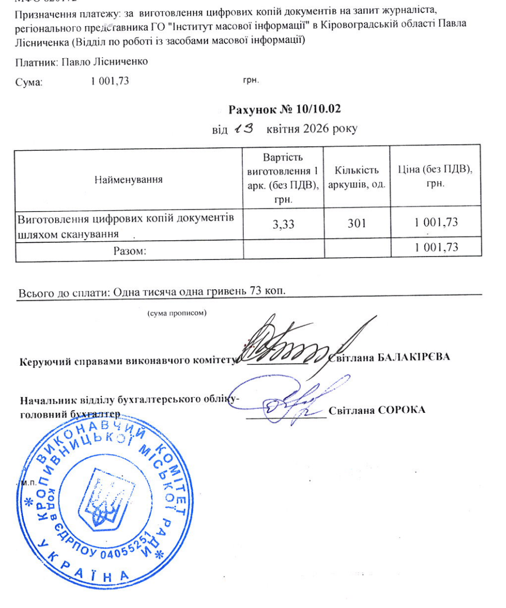 На відміну від колег з Кіровоградської ОВА місцеві чиновники можливістю надати повністю цифрову відповідь не скористались. І хоча зі строку надання відповіді також дотримались законодавчих норм, вирішили запросити оплату за сканування необхідних документів. Загальний об’єм даних в 301 аркуш оцінили в майже 1002 гривні.