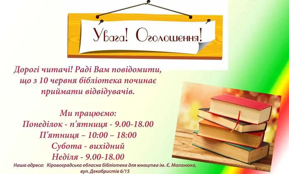Відзавтра, 10 червня, Кіровоградська обласна бібліотека для юнацтва ім. Є. Маланюка та обласна універсальна наукова бібліотека ім. Д. Чижевського починають приймати відвідувачів.