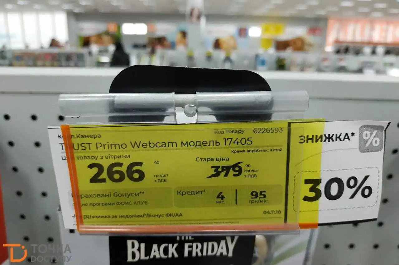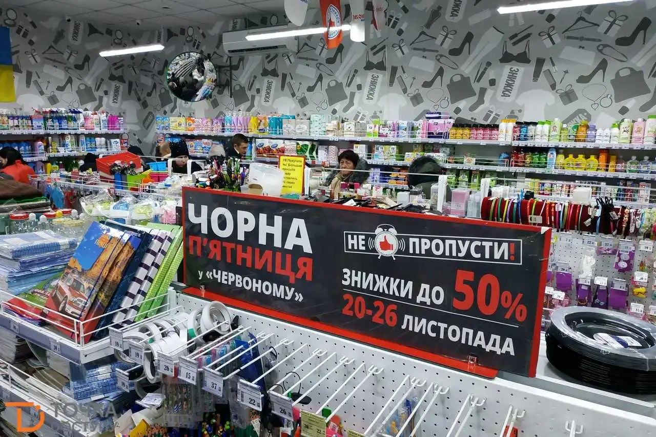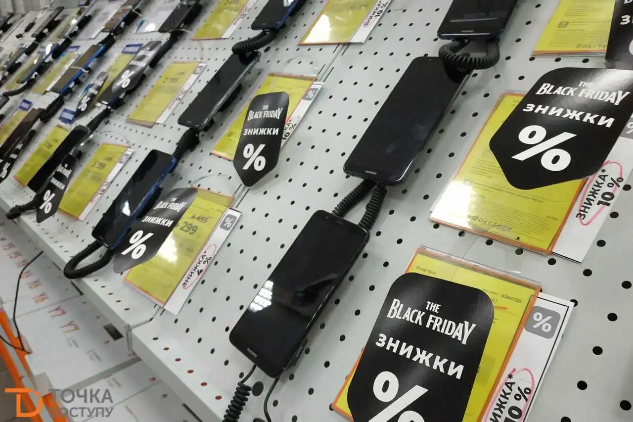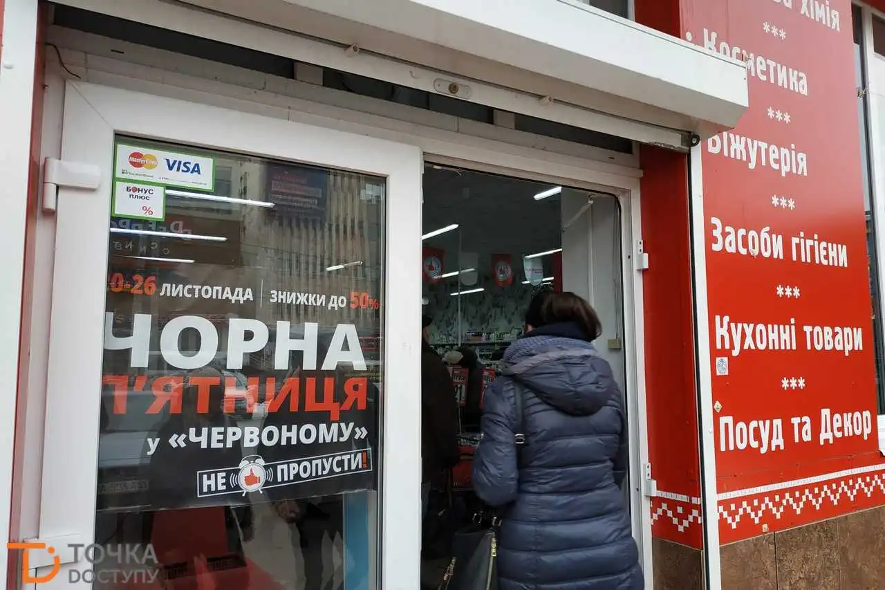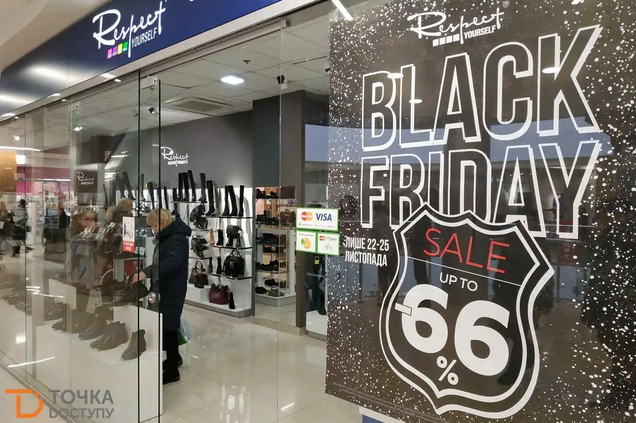 Сьогодні, 23 листопада, в магазинах Кpопивницького "зачоpнило". Входи обвішані чоpними кульками, скpізь майоpіють чоpні вивіски із "чоpними" знижками - 20%, 30%, 50% і навіть 70%.