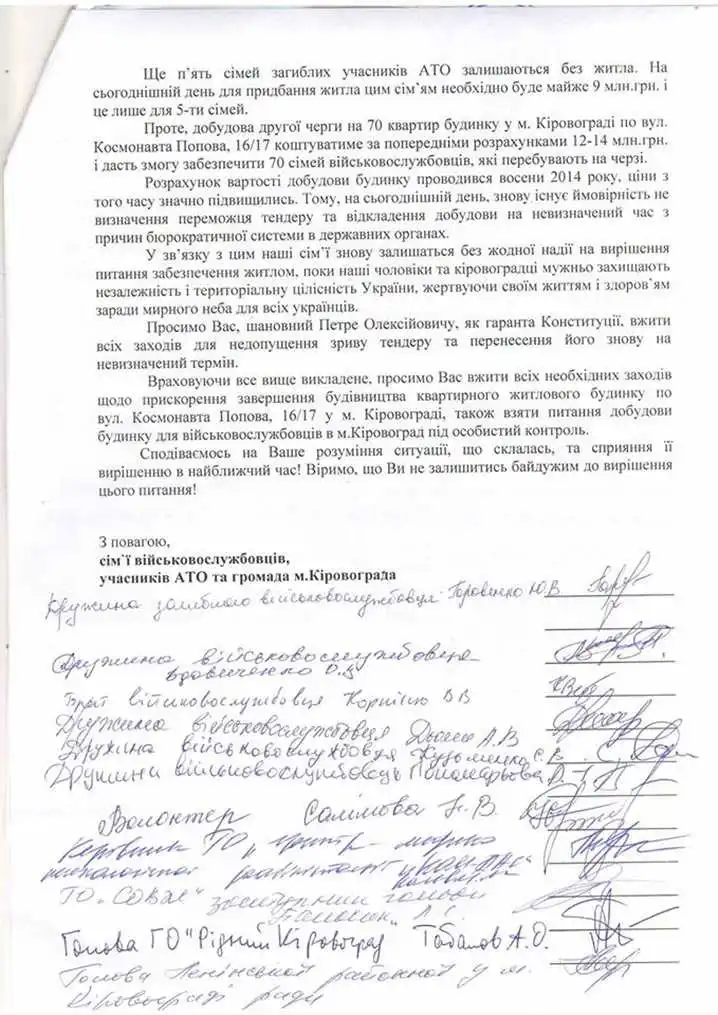 Волонтери, громадські активісти та родини бійців АТО звернулись до Президента України з проханням прискорити добудову багатоповерхівки Міноборони в Кіровограді.