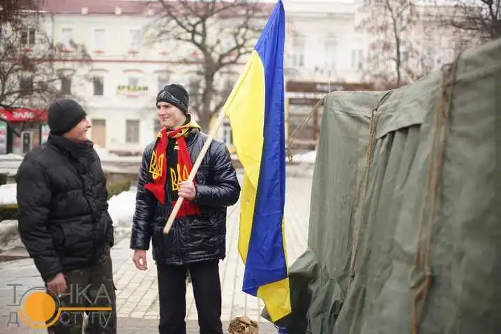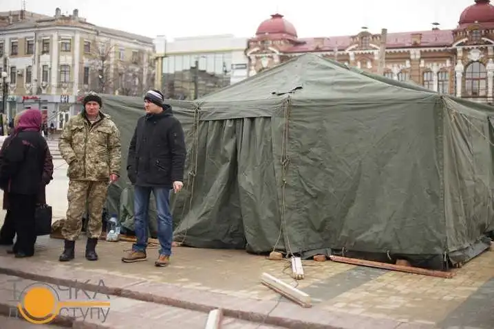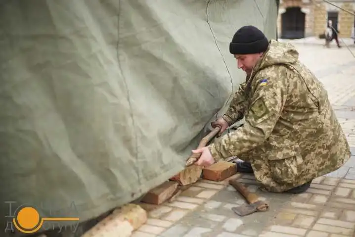 У встановленому вчора на центральній площі міста наметі чергують бійці, кажуть, що не підуть звідти, поки не доб’ються прискорення вирішення питання з отриманням земельних ділянок.