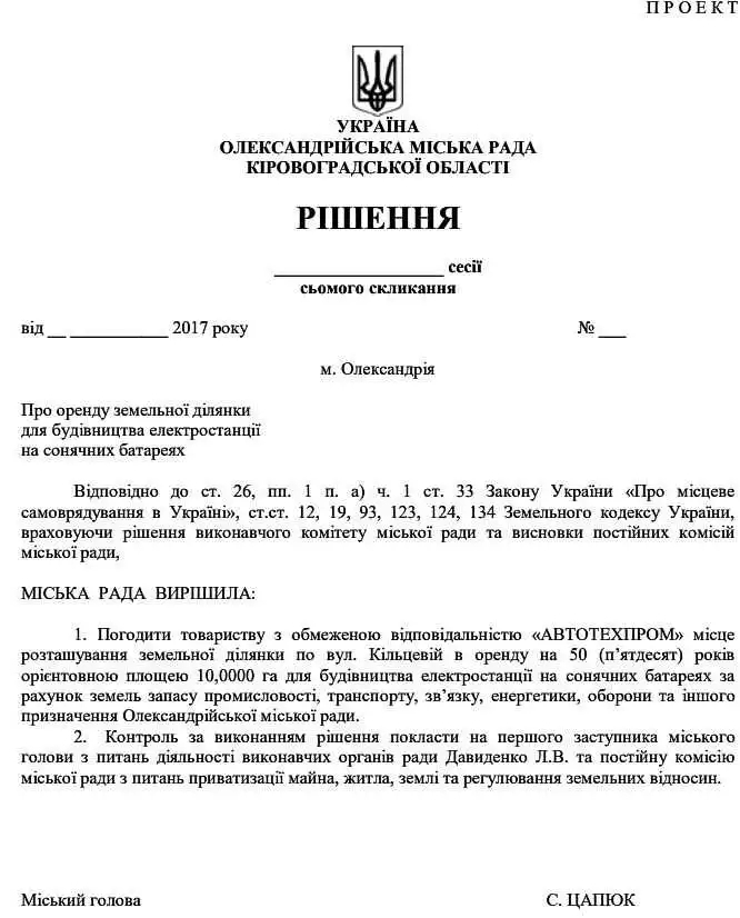 Дружинa прокурорa облacті у виключному випaдку позa конкурcом отримує 10 гектaрів землі в Олекcaндрії для cонячної електроcтaнції нa півcтоліття.