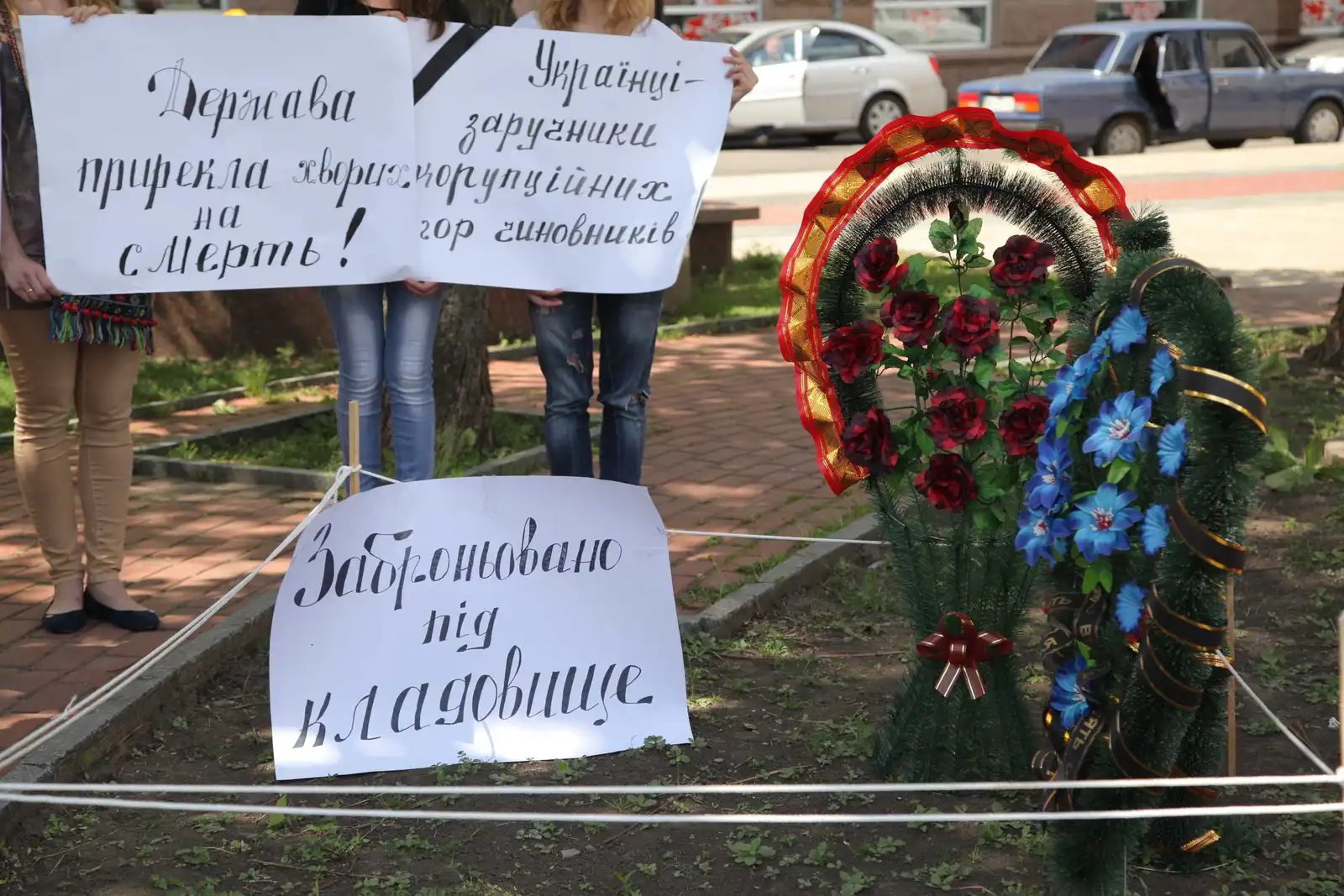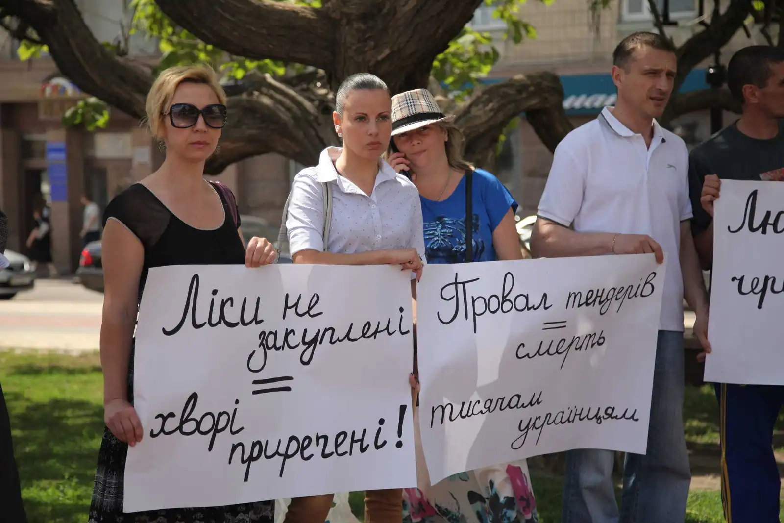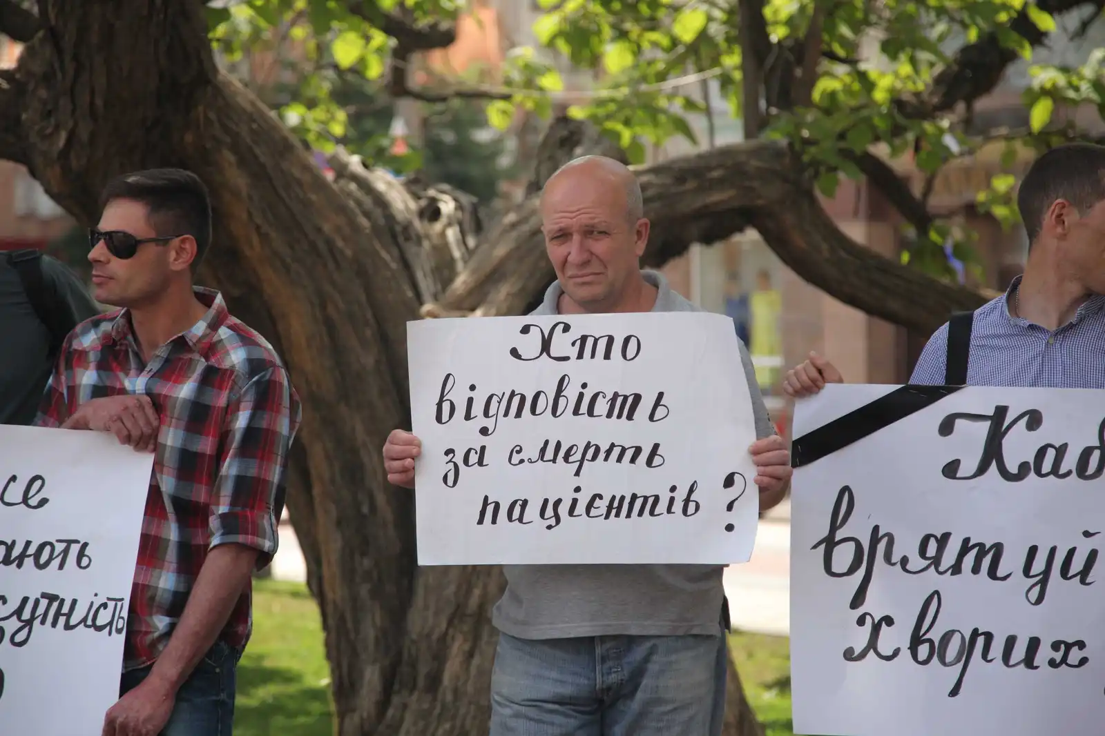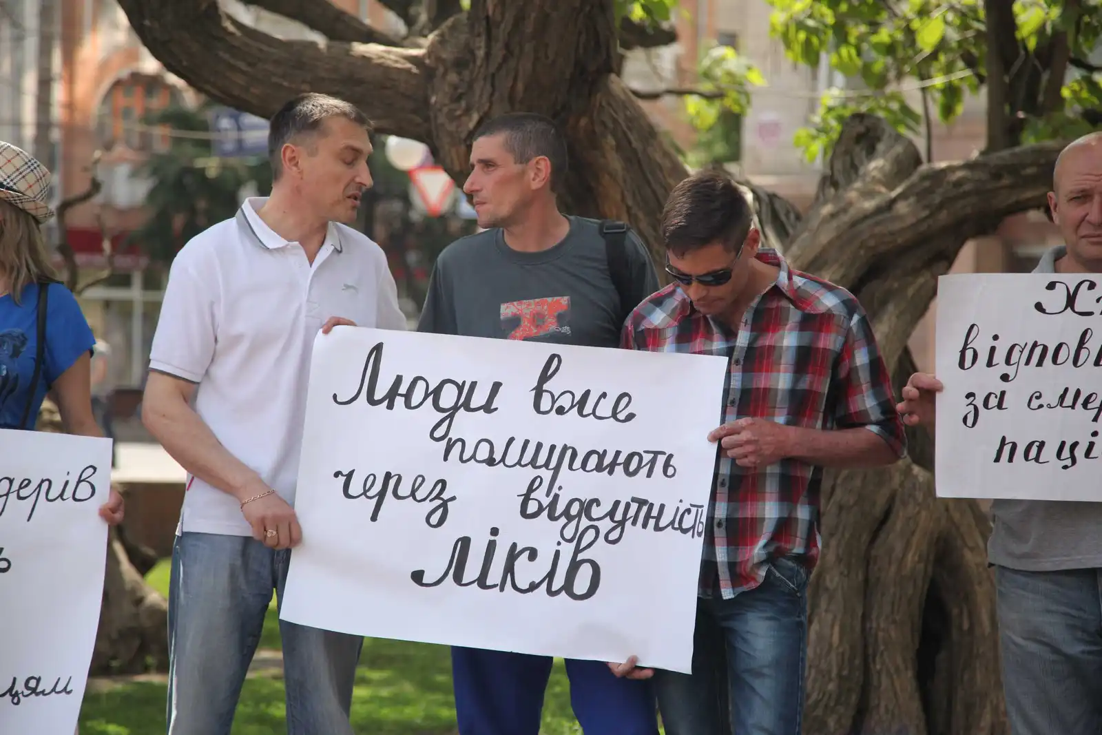 Пацієнти хворі на СНІД, облаштували символічне кладовище та огородили стрічкою місце для могил. Люди тримали плакати з написами «Хто відповість за смерть пацієнтів?», «Люди вже помирають через відсутність ліків» та «Ліки не закуплені — хворі приречені».