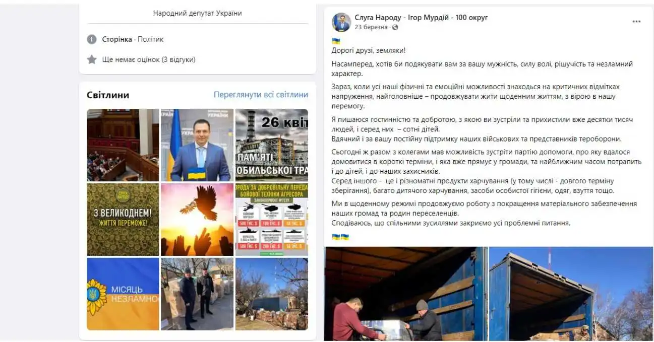 Ігор Мурдій також долучався до гуманітарної допомоги. У соцмережах він зазначив, що серед вантажів, які він зустрічав і про які домовлявся, — різноманітні продукти харчування (у тому числі довгого терміну зберігання), багато дитячої їжі, засоби особистої гігієни, одяг, взуття тощо.