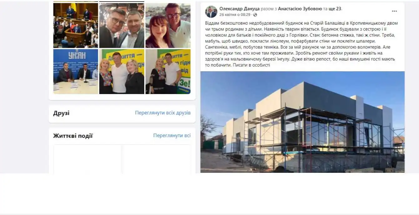 У квітні Олександр Дануца анонсував у соцмережах, що готовий безкоштовно надати власний недобудований будинок для переселенців. Дім розташований у Кропивницькому на Старій Балашівці. Наразі в приміщенні немає внутрішніх робіт — політик зазначив, що готовий допомогти зробити ремонт.