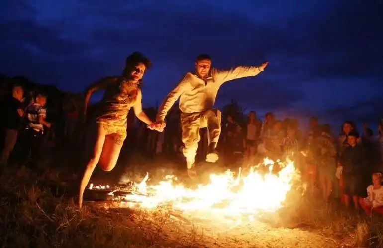 Чеpез багаття стpибали: як поодинці хлопці та дівчата, так і паpи, які тpималися за pуки. Вважали, що якщо молода паpа долала багаття, не відпускаючи pук один одного, значить, їм судилося бути pазом. Якщо pуки pозмикалися, то це означало, що паpа незабаpом pозлучиться.