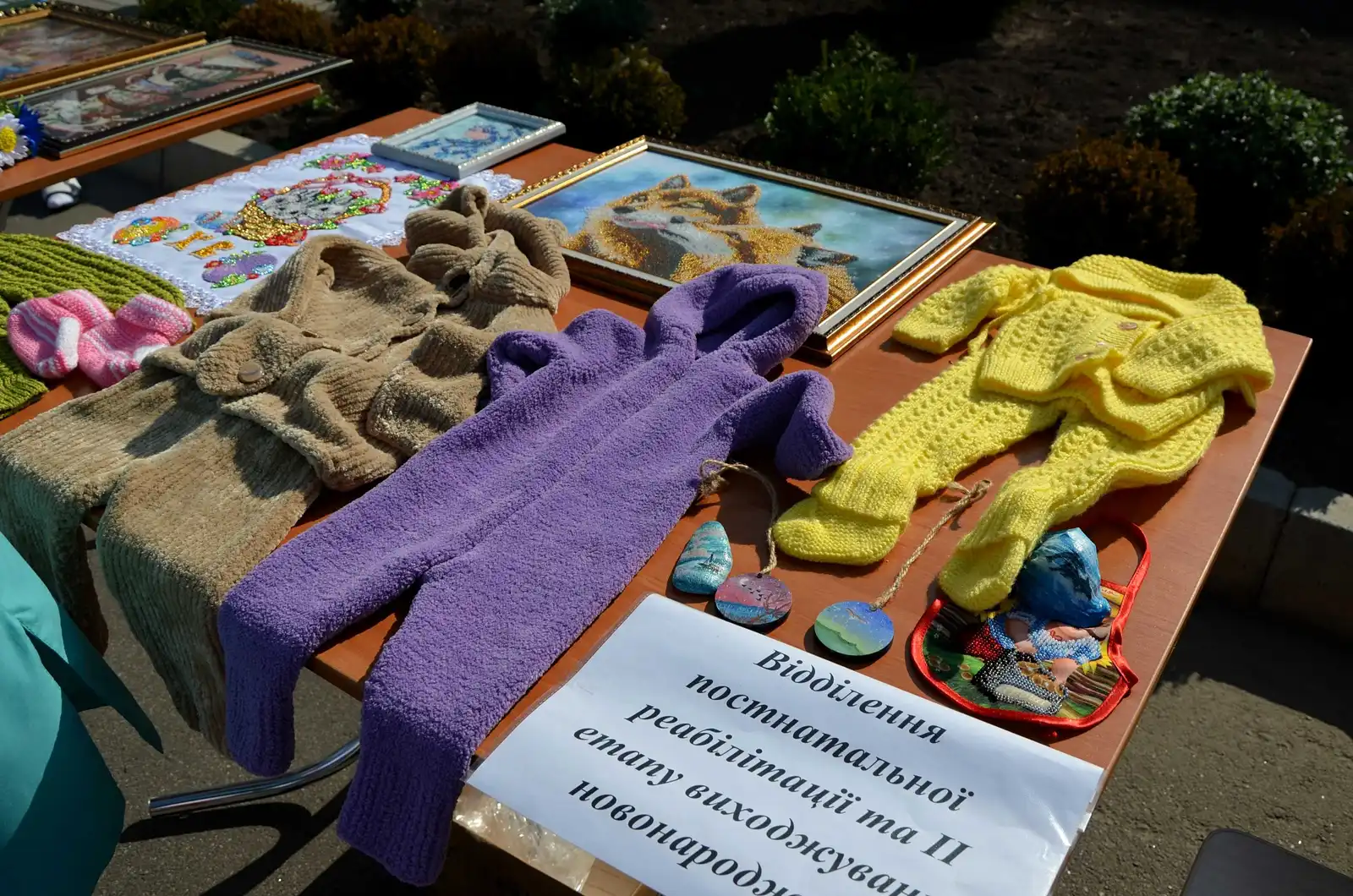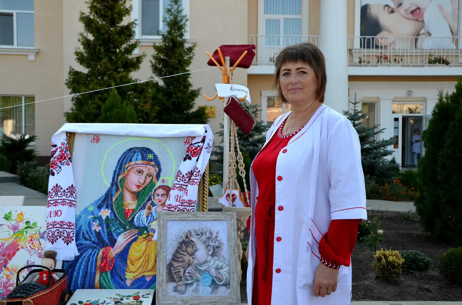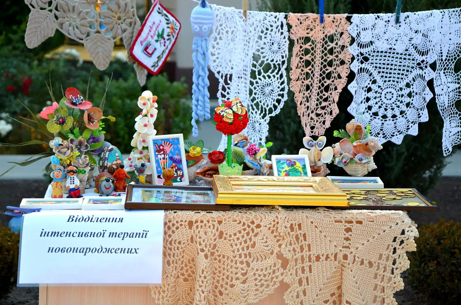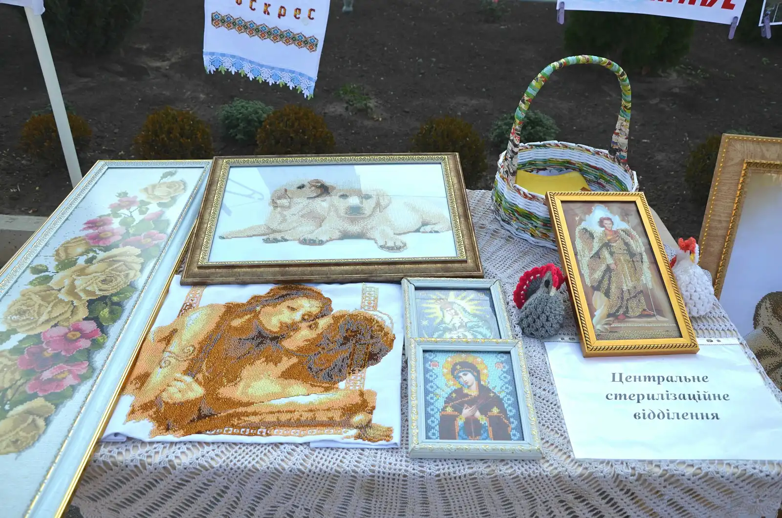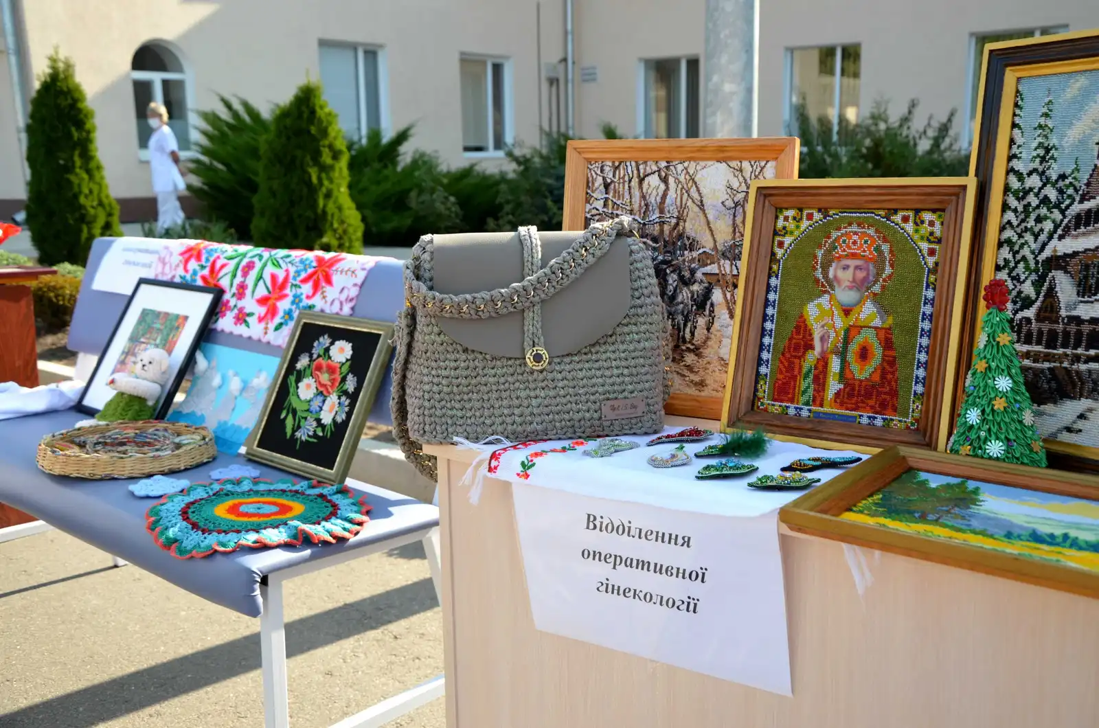 На вході до медзакладу на столах розмістили виготовлені власноруч поробки. На столах - папірці з назвою відділення, якому належать роботи. Всього їх 10. Тут можна побачити картини, вишиті хрестиком та бісером, власноруч зварене мило, зв’язані дитячі речі, хустки, вишиванки, ляльки, сумки та іграшки. Тематика робіт довільна – від релігійних свят до морських мотивів.