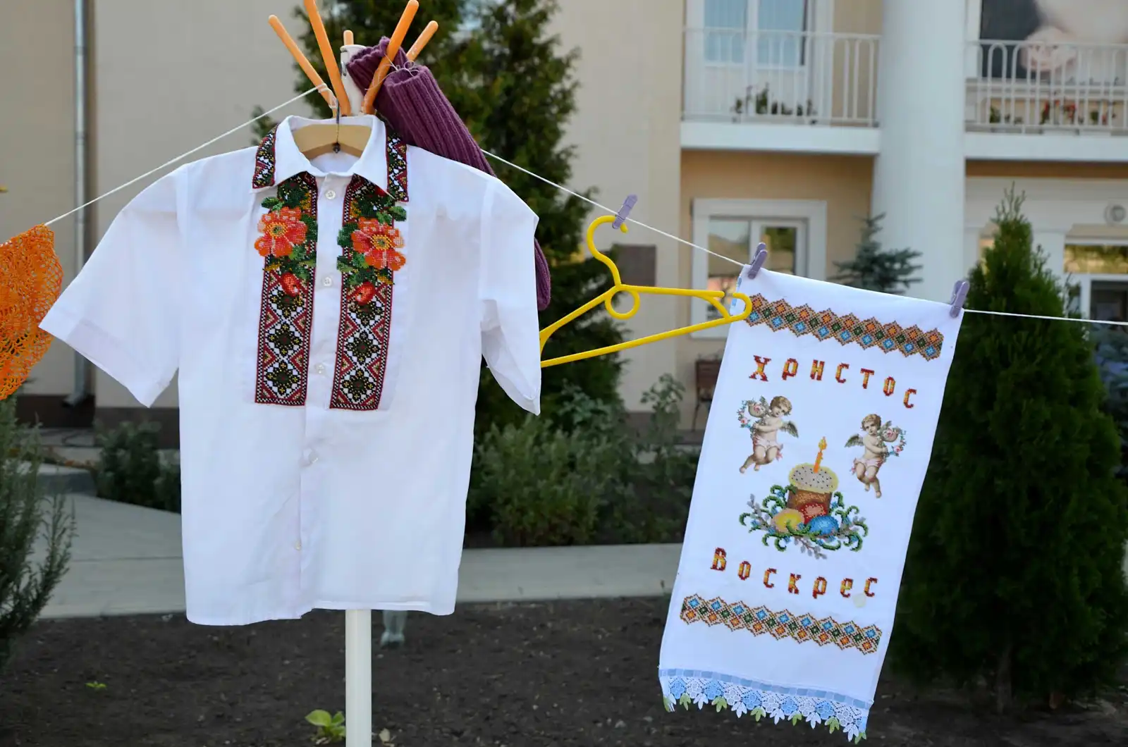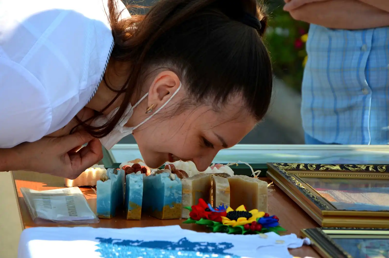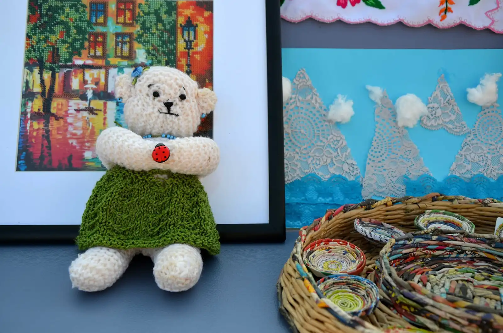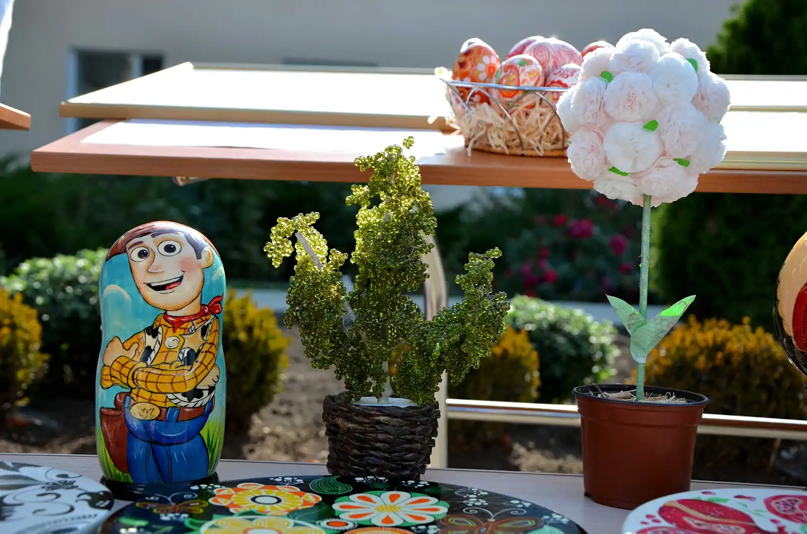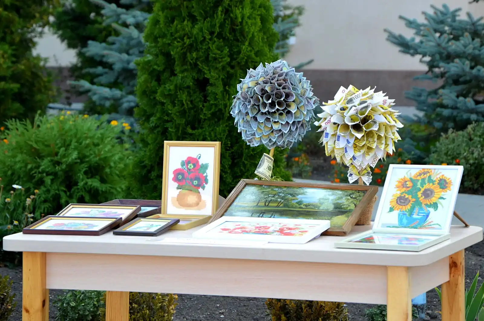 На вході до медзакладу на столах розмістили виготовлені власноруч поробки. На столах - папірці з назвою відділення, якому належать роботи. Всього їх 10. Тут можна побачити картини, вишиті хрестиком та бісером, власноруч зварене мило, зв’язані дитячі речі, хустки, вишиванки, ляльки, сумки та іграшки. Тематика робіт довільна – від релігійних свят до морських мотивів.