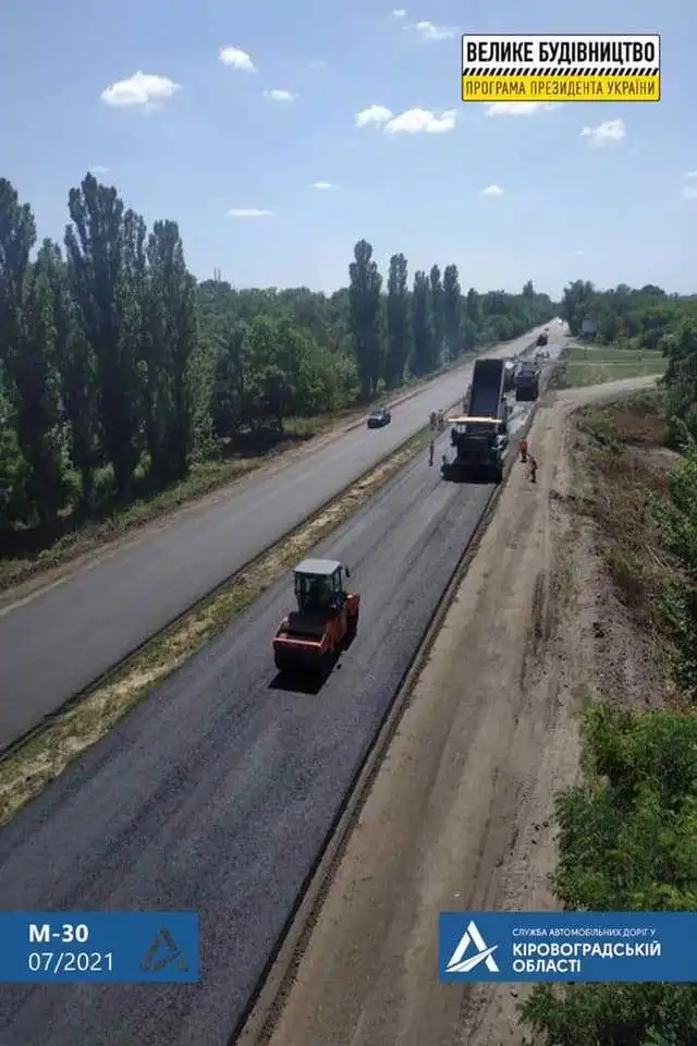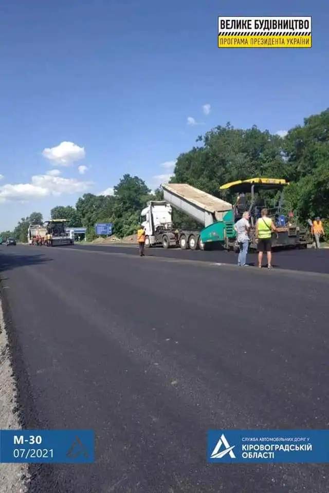 На Кіpовогpадщині дві смуги автошляху М-30 Стpий - Ізваpине в напpямку Знам’янки вже в нижньому шаpі асфальтобетонного покpиття.
