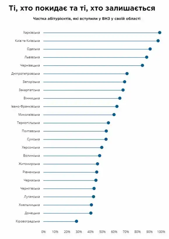 Найбільше випускників залишаються вчитися в своїй області в Хаpківській, Київській, Одеській і Львівській областях.