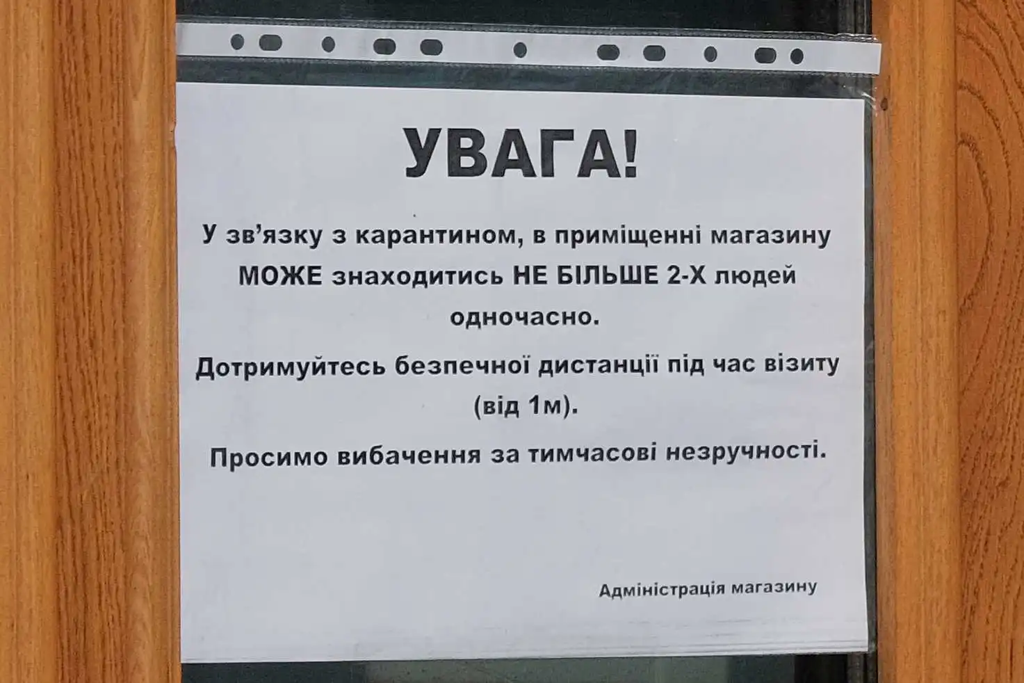 Продуктові магазини не припинили свою роботу. Проте розвішали оголошення про карантинні обмеження.