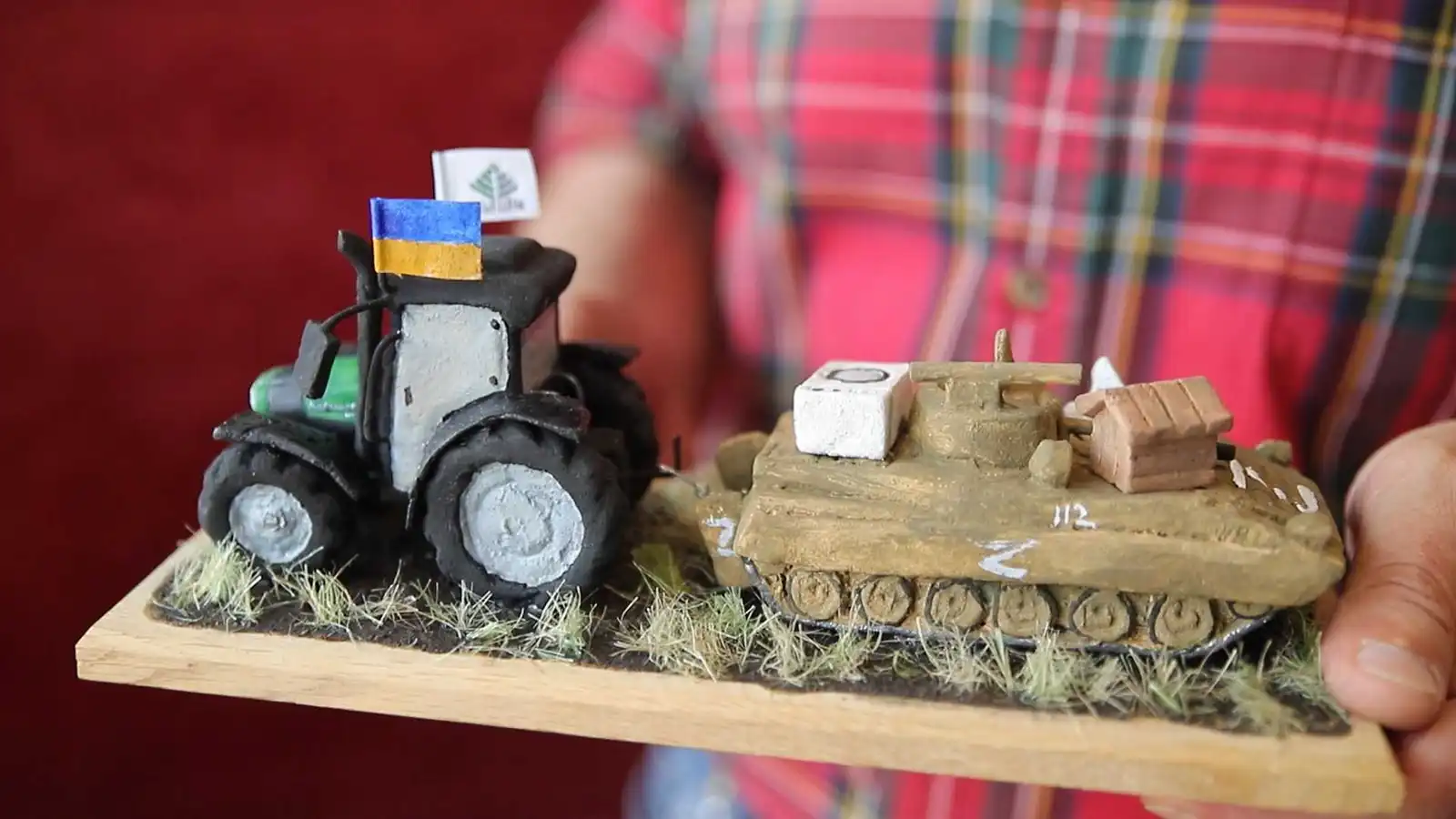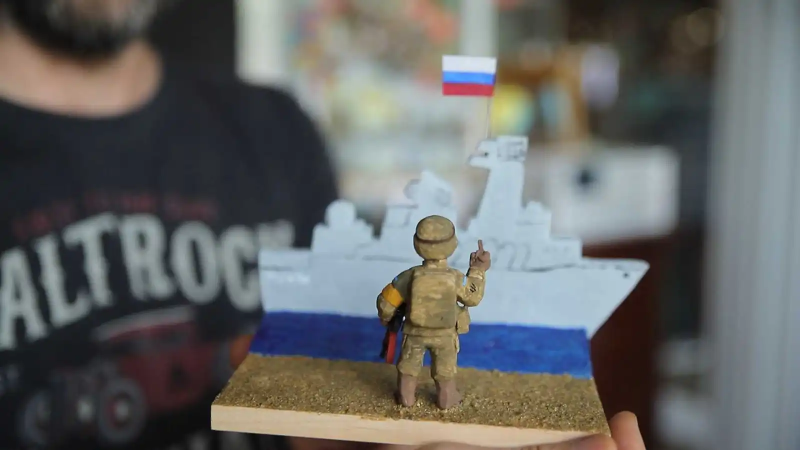 Першою в даній тематиці була ця робота – трактор, який тягне російський БТР, на якому вкрадені окупантами речі. Я задумав композицію, коли пройшла інформація про те, що українські фермери поцупили ворожий БТР. Потім з’явилося відео і мене дуже зацікавив тракторець своїми формами, хоча я не люблю техніку. Корабель теж має свою історію: марка вийшла і дістати її неможливо було, то я зробив собі марку сам. Ну, а потім люди почали просити. Виявилося, що це легше, ніж купити марку, – розповідає Володимир Крутоус.
