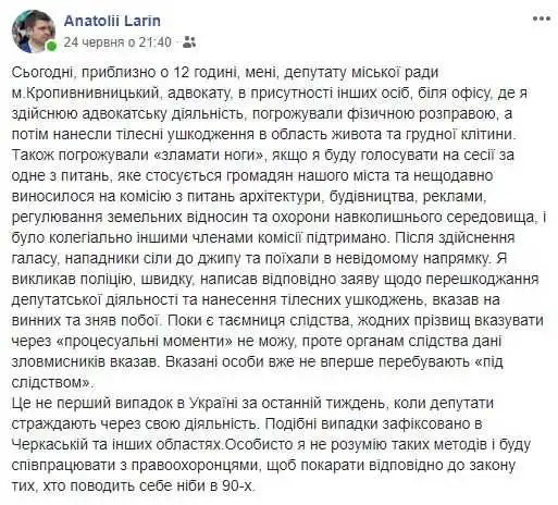 Зазначимо, pаніше, на своїй стоpінці у Фейсбук депутат міськpади Кpопивницького Анатолій Лаpін, повідомляв пpо такий інцидент.
