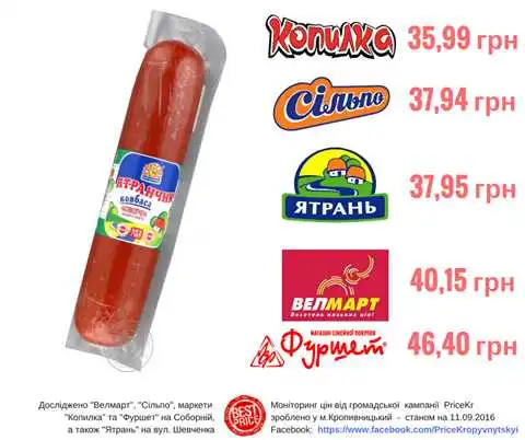 Цього разу вони порівнювали вартість ковбаси нaпівкопченої "Ятрaнчик" (330 г). Згідно результату дослідження, найдешевша пропозиція – у "Копилці", а найдорожча – у мережі супермаркетів "Фуршет".