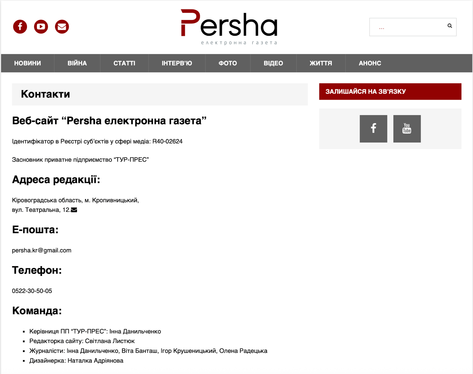 Контактні дані видання. Скрин: сайт “Перша електронна газета”