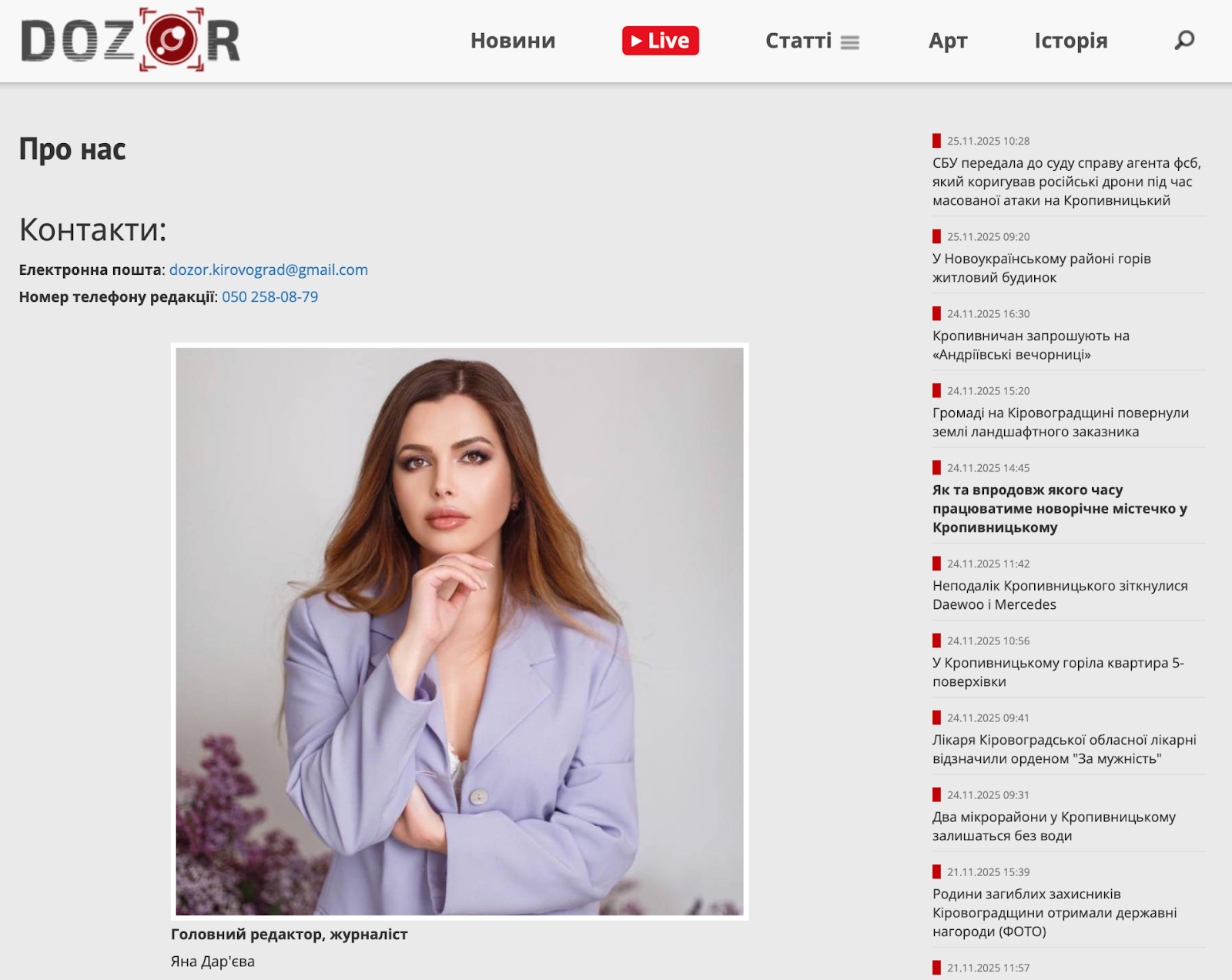 У контактних даних видання є електронка, телефон і дані редакторки. Скрин: сайту “Dozor”