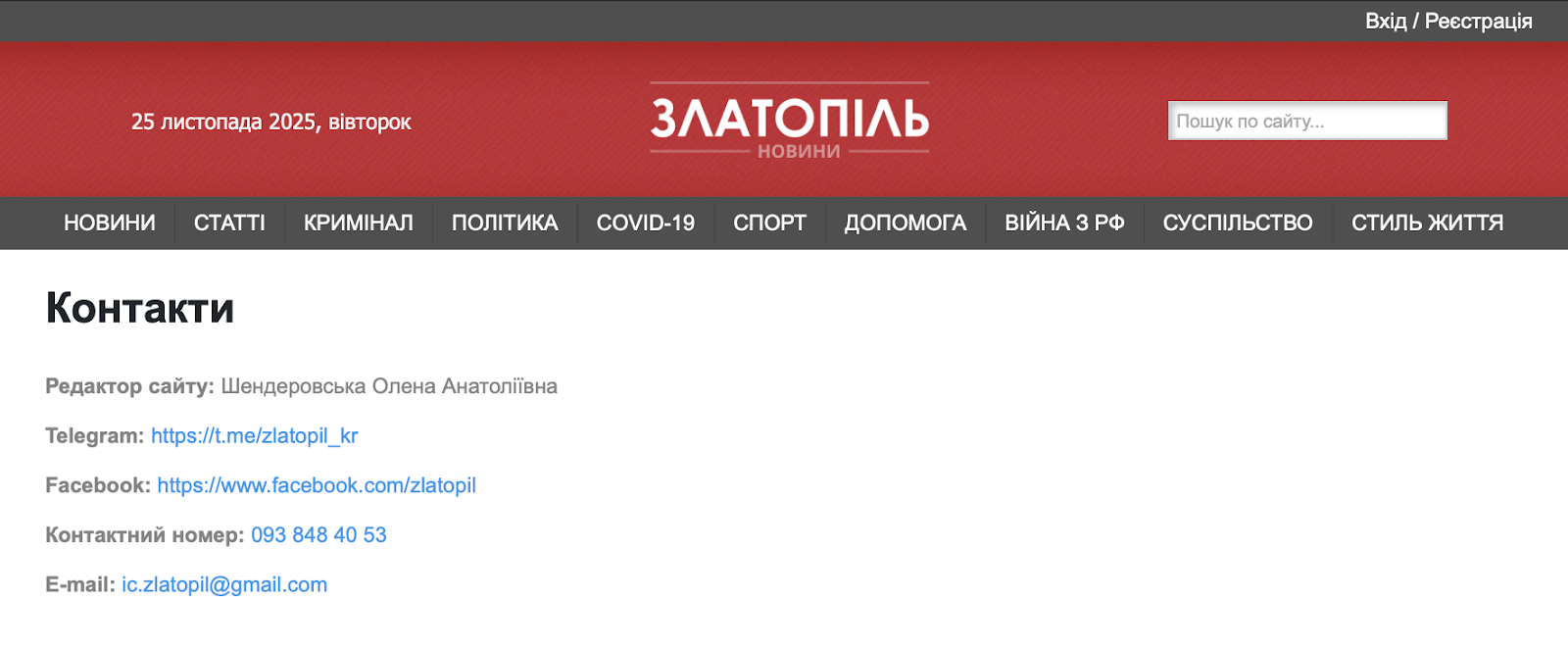 Аналогічне недопрацювання ми виявили й у “Златополя”. Прізвище та ім’я редактора, контактний номер телефону та електронна пошта, навіть сторінки видання в фейсбуці і телеграмі. Єдине чого бракує - фізичної адреси.