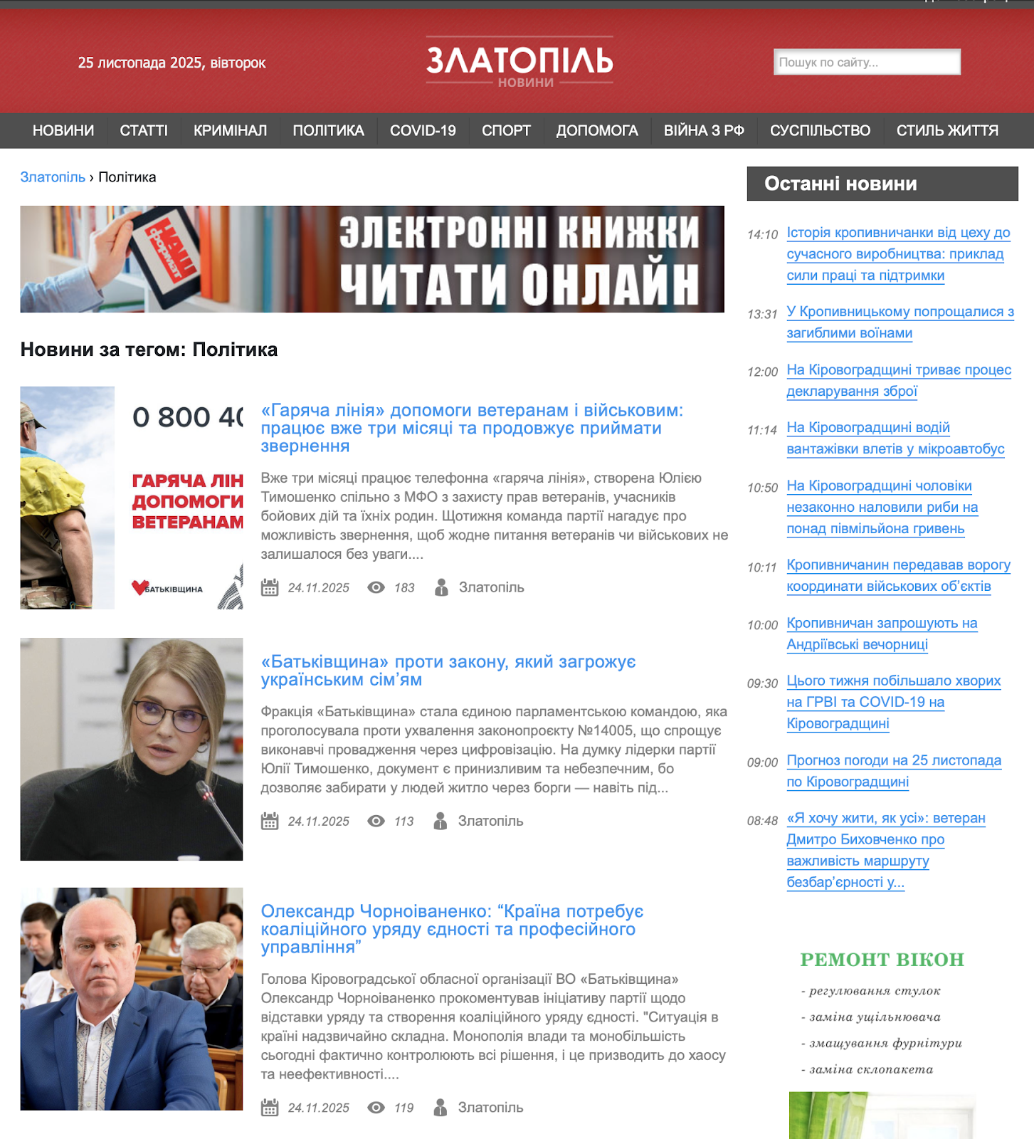 Політична джинса “Батьківщини” в стрічці новин видання. Скрин: сайт “Златопіль”