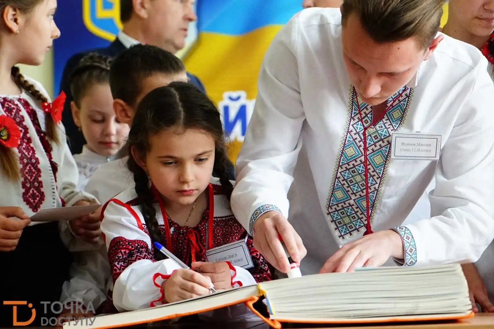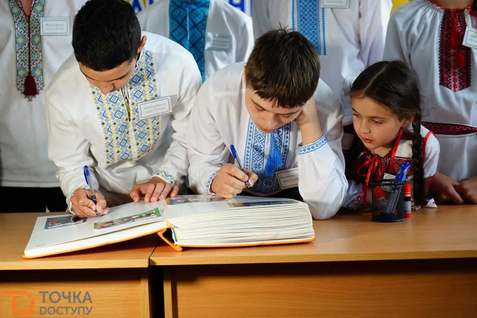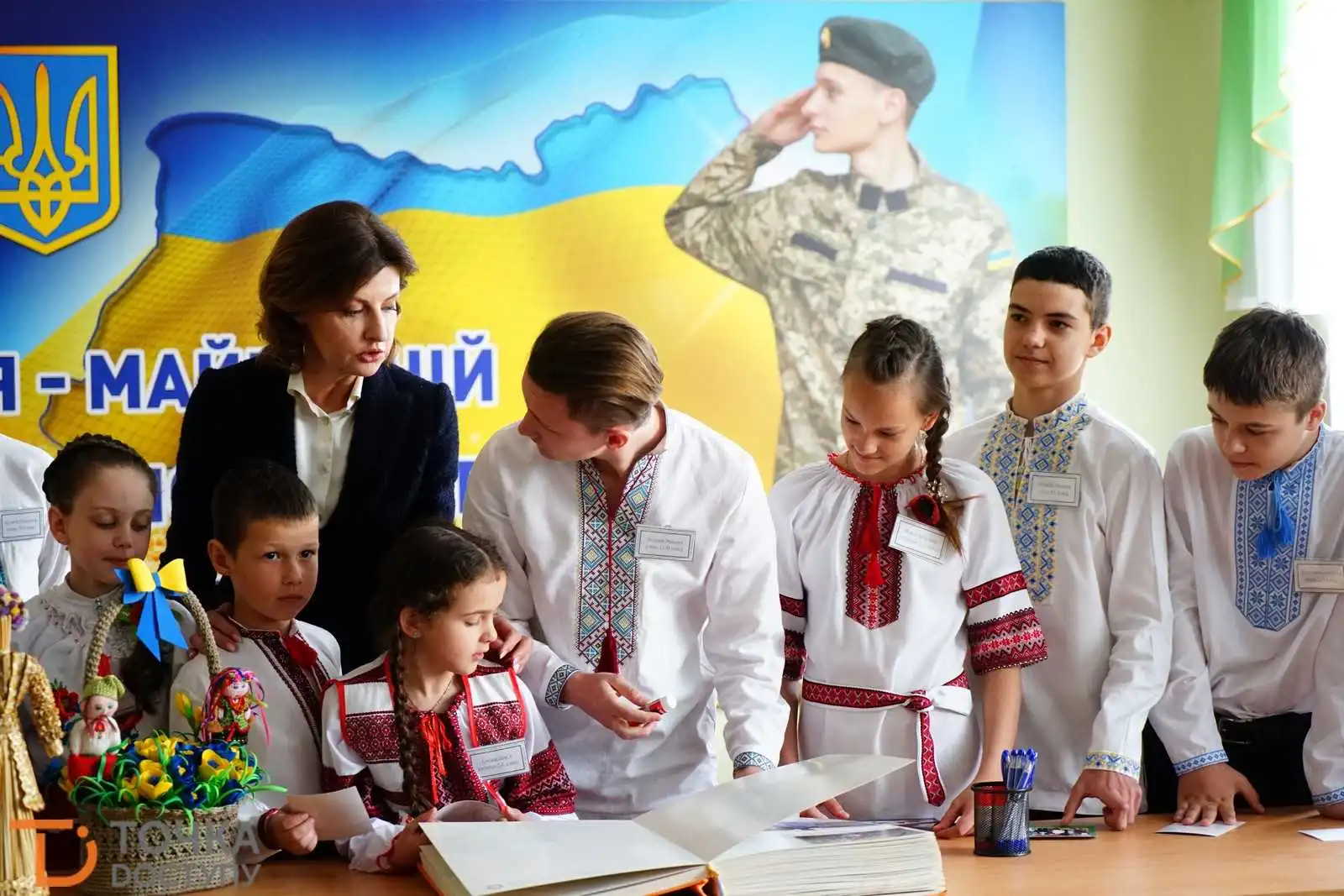 Крім того, сьогодні в навчальному закладі №16 перша леді разом зі школярами Кропивницького, чиї батьки захищають територіальну цілісність на Сході України, вписали нові сторінки в загальнонаціональний проект «Книга Миру».