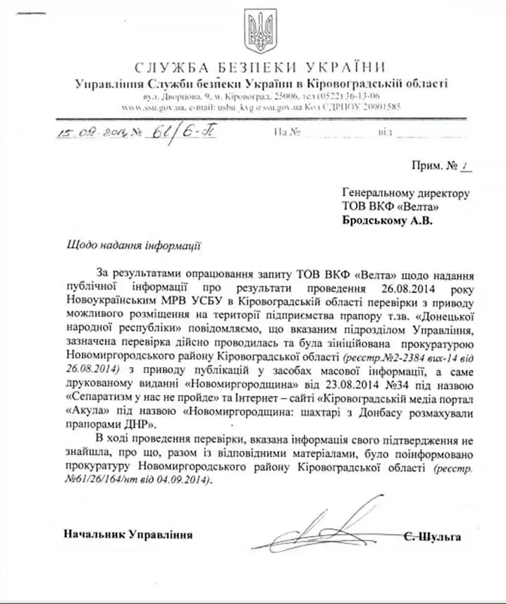 2 вересня поточного року на засіданні виконавчого комітету Новомиргородської міської ради Яків Немировський заявив, що співробітники компанії “Велта” – а це більше 600 жителів області – мають сепаратистські настрої.