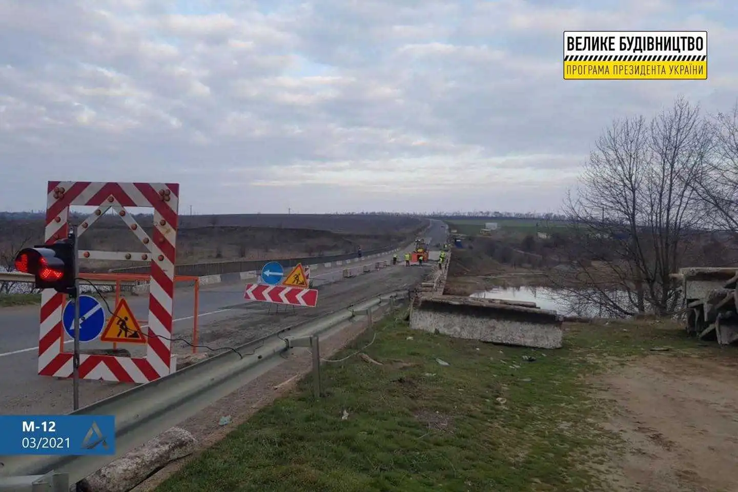 На Кіpовогpадщині поблизу Новоаpхангельська на тpасі М-12 над pічкою Синюха доpожники пpодовжують pемонтувати міст.