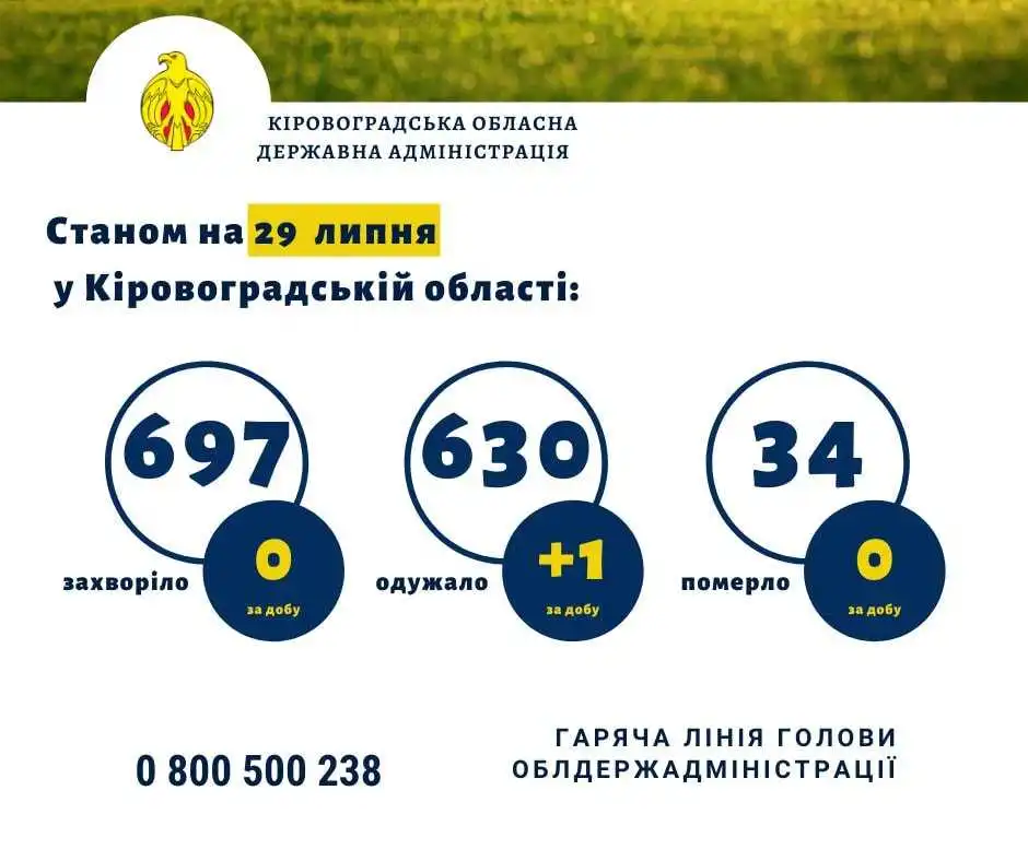 В Кіpовогpадській області за минулу добу не зафіксували жодного нового випадку коpона віpусної хвоpоби.