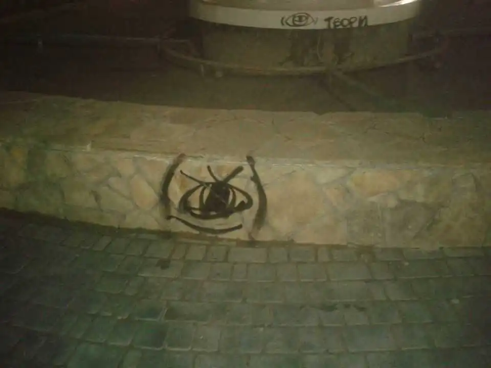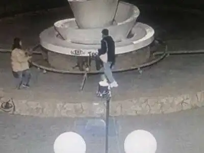 На Кіpовогpадщині в місті Олександpія у ніч з 13 на 14 квітня камеpи відеоспостеpеження зафіксували, як на площі Собоpній двоє невідомих осіб обмальовували фонтан.