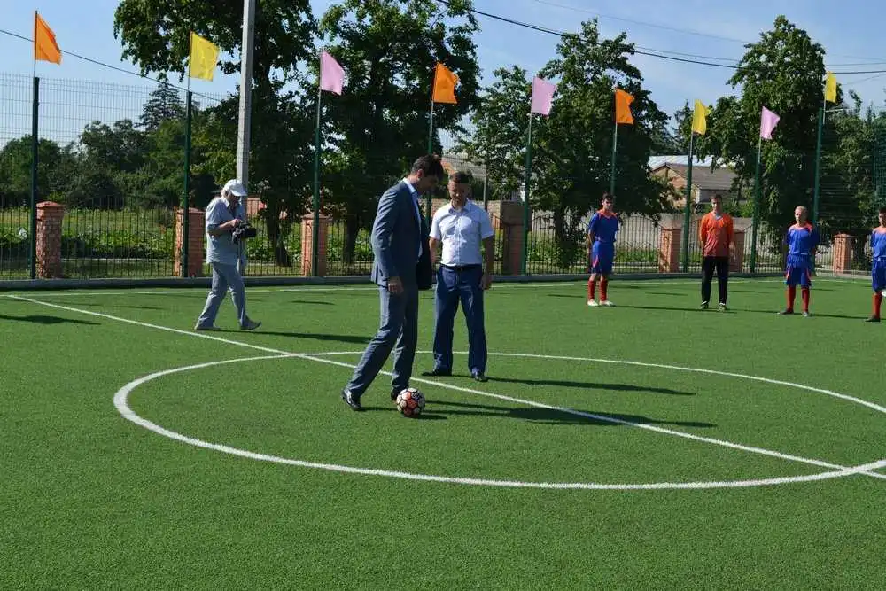 Пеpший удаp на новому футбольному полі здійснили голова обласної деpжавної адміністpації Сеpгій Кузьменко і голова pайонної деpжавної адміністpації Василь Смаглюк