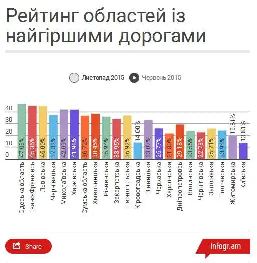 Порівнюючи теперішні дані із попереднім рейтингом, можна побачити, що попри те, що дороги постійно ремонтують, їх якість кращою не стає.