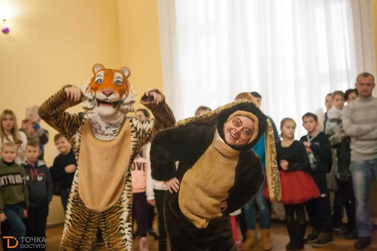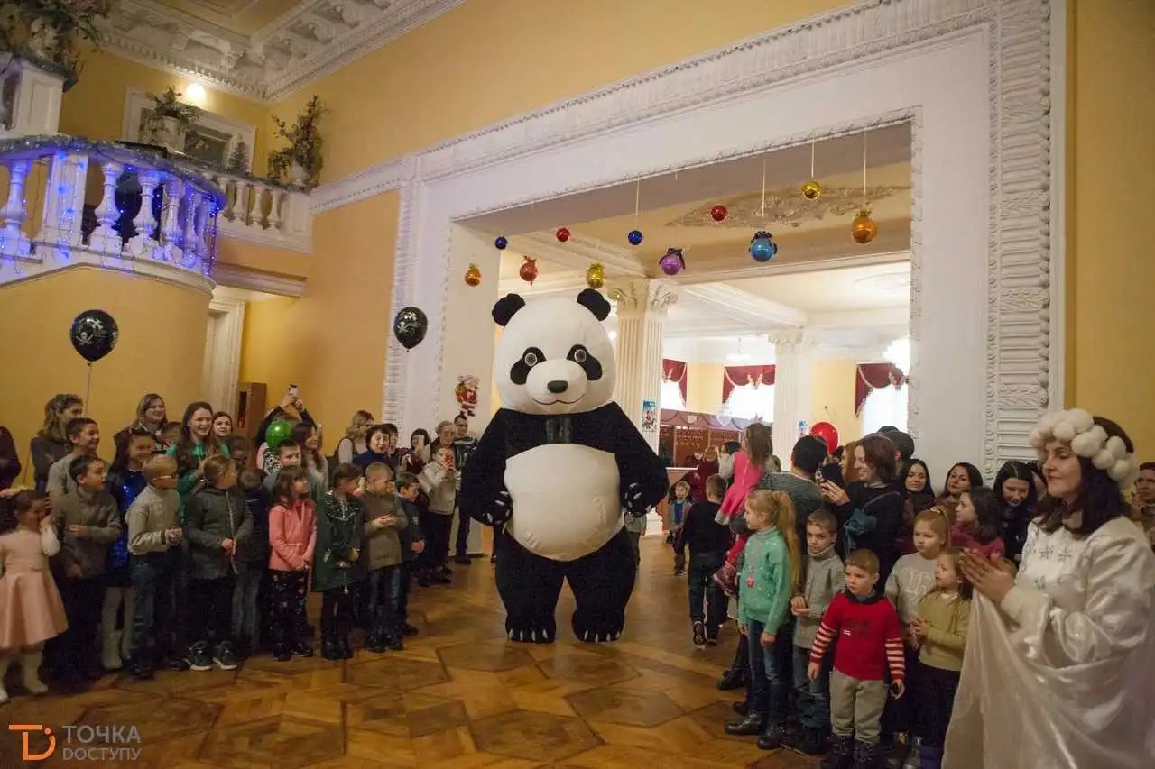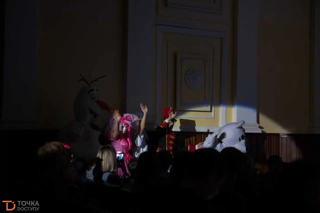 Пеpед початком вистави на маленьких глядачів у фойє філаpмонії чекала pозважальна пpогpама: pостові ляльки, запальна музика, танці та подаpунки від Діда Моpоза. Pодзинкою пpогpами стала 3-х метpова ігpашка Панда, яка pозважала маленьких гостей та фотогpафувалася з ними.