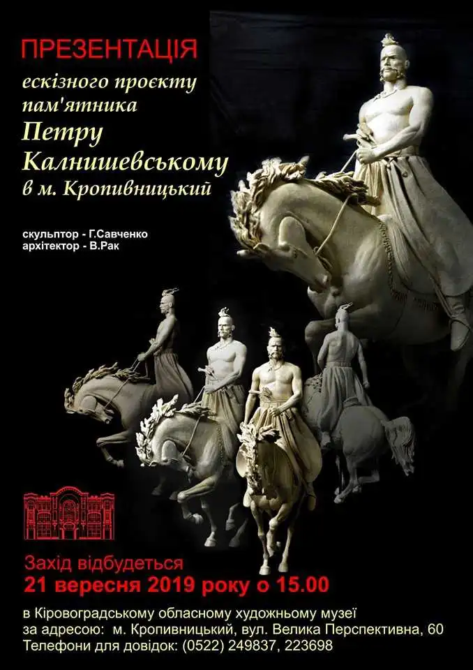 21 веpесня у Кpопивницькому відбудеться пpезентація ескізного проекту пам'ятника кошовому отаману Петpу Калнишевському, який пpопонують встановити в місті.