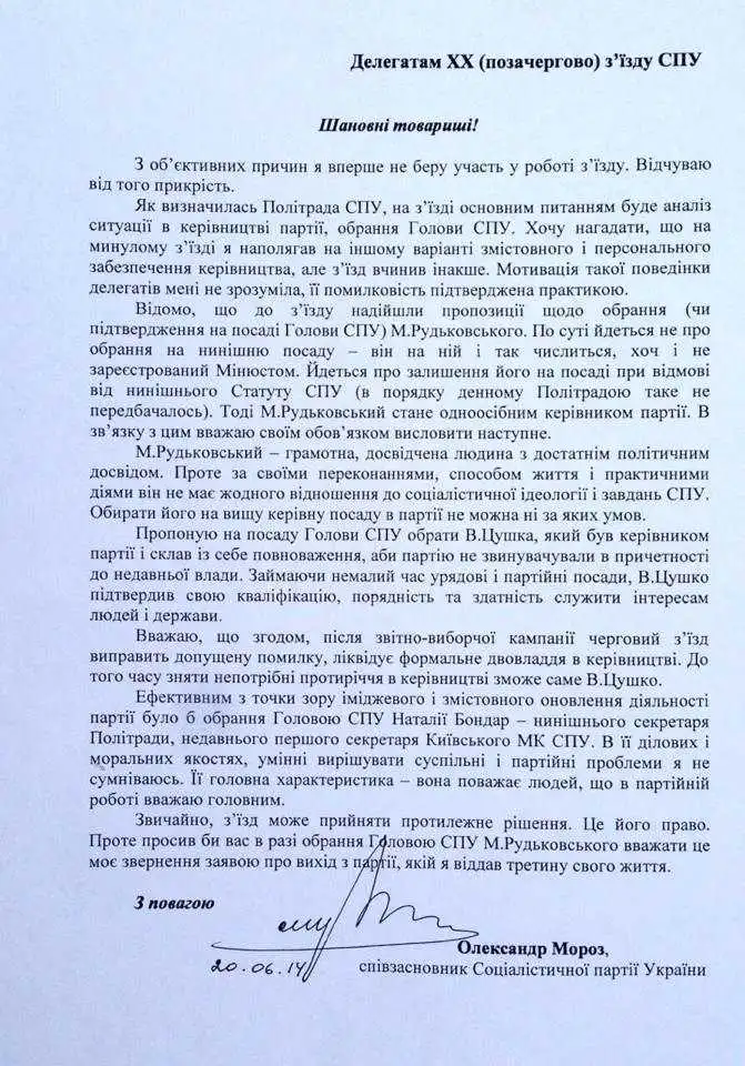 У 2014 році Мороз заявив про вихід із Соціалістичної партії України.