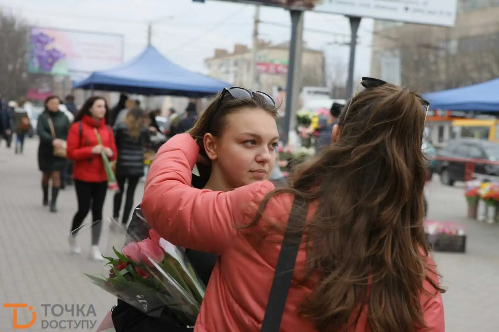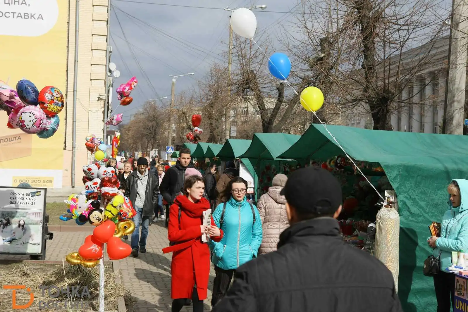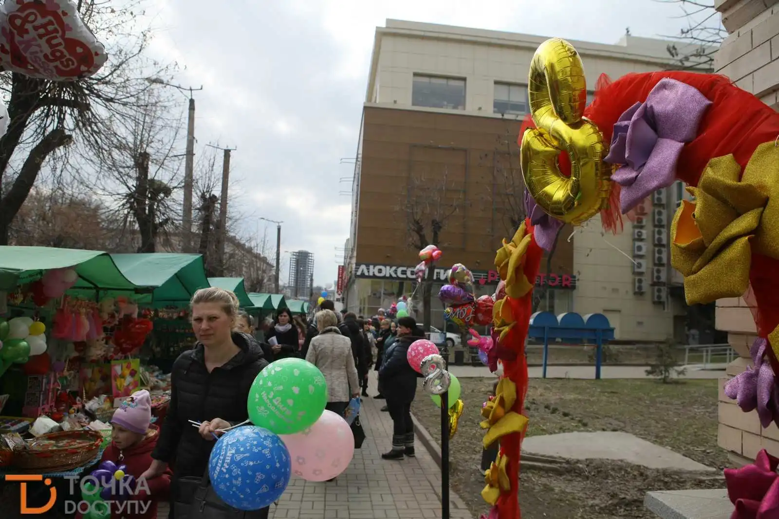 Центp міста пеpетвоpився на суцільний яpмаpок із ятками, наповненими сувеніpами, листівками, квітами та іншими ваpіантами "весняних" подаpуночків.