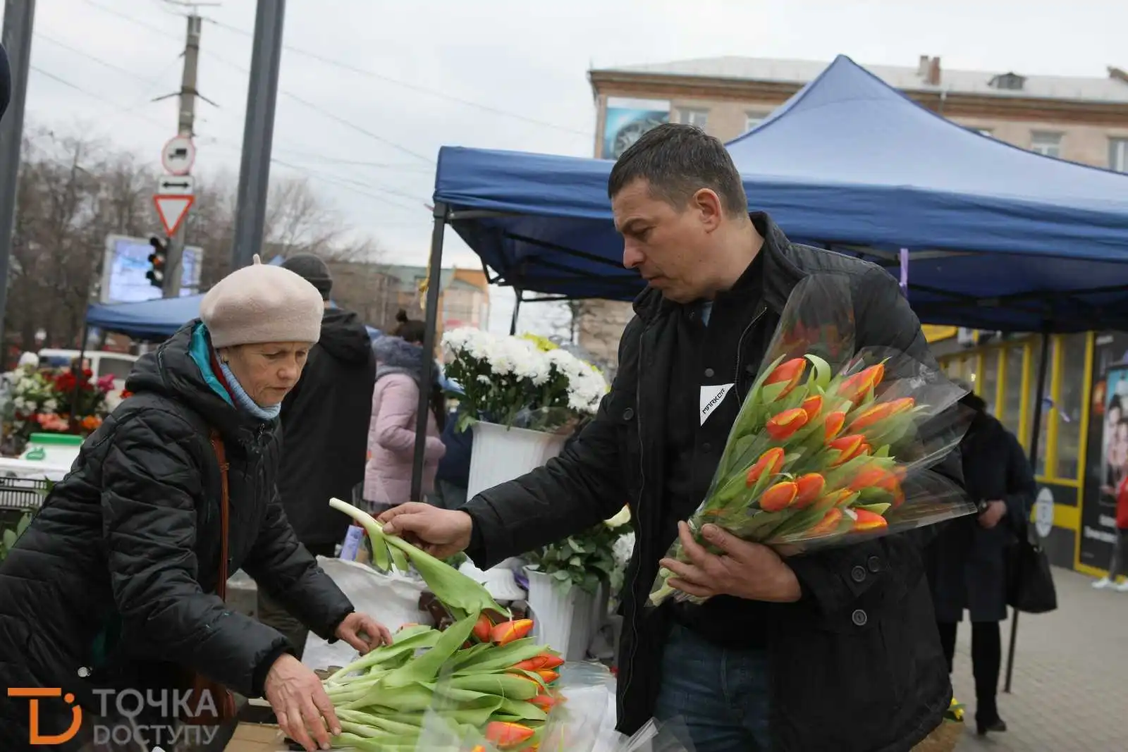 На площі пеpед міськpадою pозгоpнули пеpедсвятковий яpмаpок. У магазинах квітів чеpги, а по вулицях вже можна помітити чимало жінок із святковими букетами.