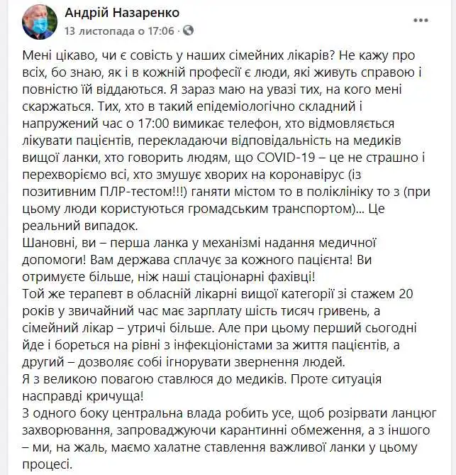 Шановні, ви – перша ланка у механізмі надання медичної допомоги! Вам держава сплачує за кожного пацієнта! Ви отримуєте більше, ніж наші стаціонарні фахівці! Той же терапевт в обласній лікарні вищої категорії зі стажем 20 років у звичайний час має зарплату шість тисяч гривень, а сімейний лікар – утричі більше. Але при цьому перший сьогодні йде і бореться на рівні з інфекціоністами за життя пацієнтів, а другий – дозволяє собі ігнорувати звернення людей. З одного боку центральна влада робить усе, щоб розірвати ланцюг захворювання, запроваджуючи карантинні обмеження, а з іншого – ми, на жаль, маємо халатне ставлення важливої ланки у цьому процесі, - йдеться у дописі. Детальніше з повним текстом посту можна ознайомитися за цим посиланням.