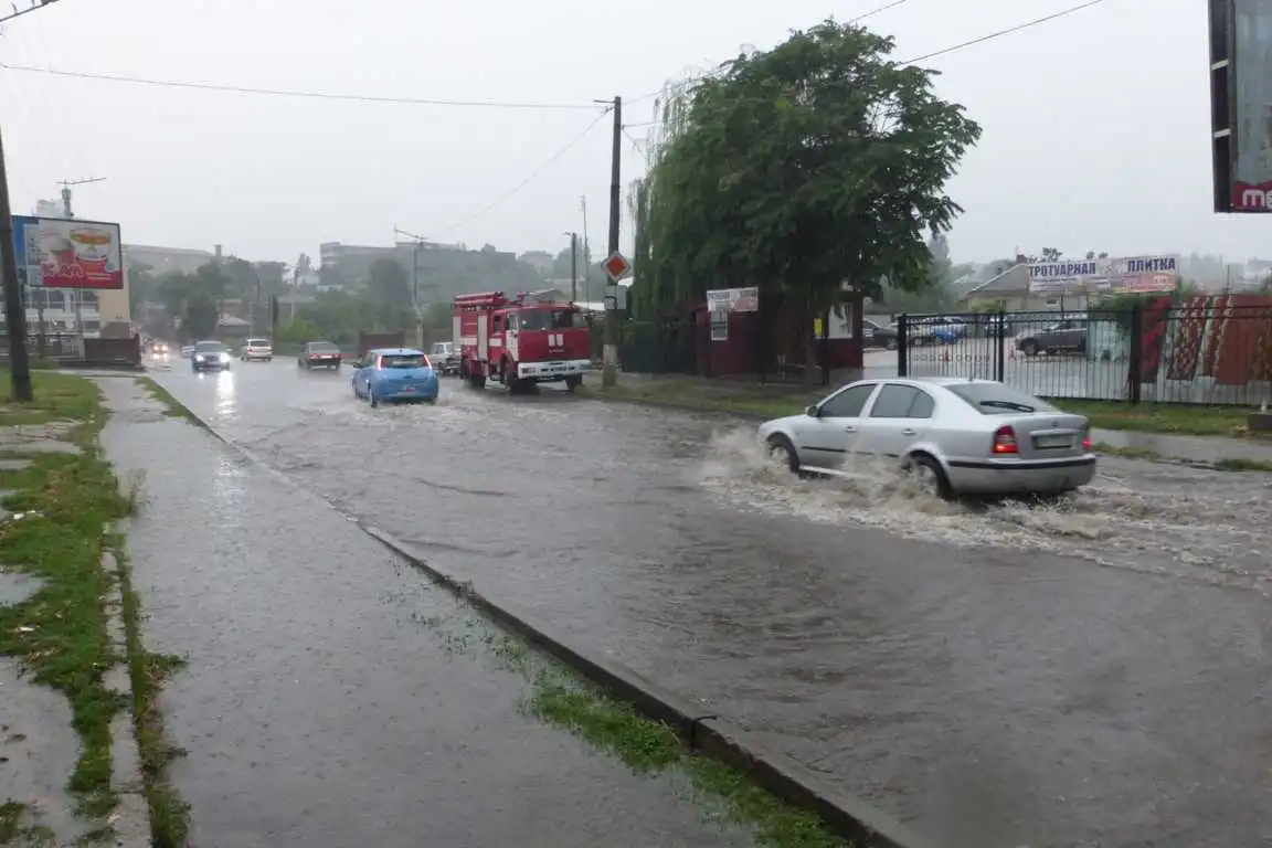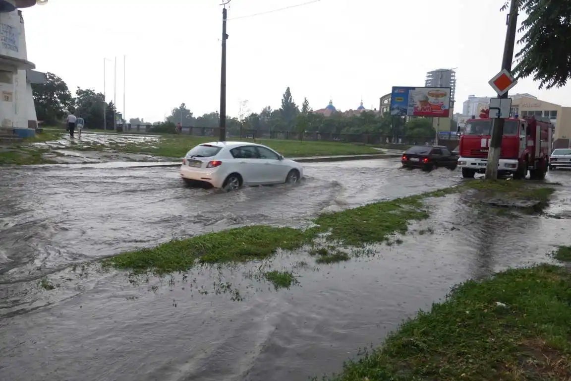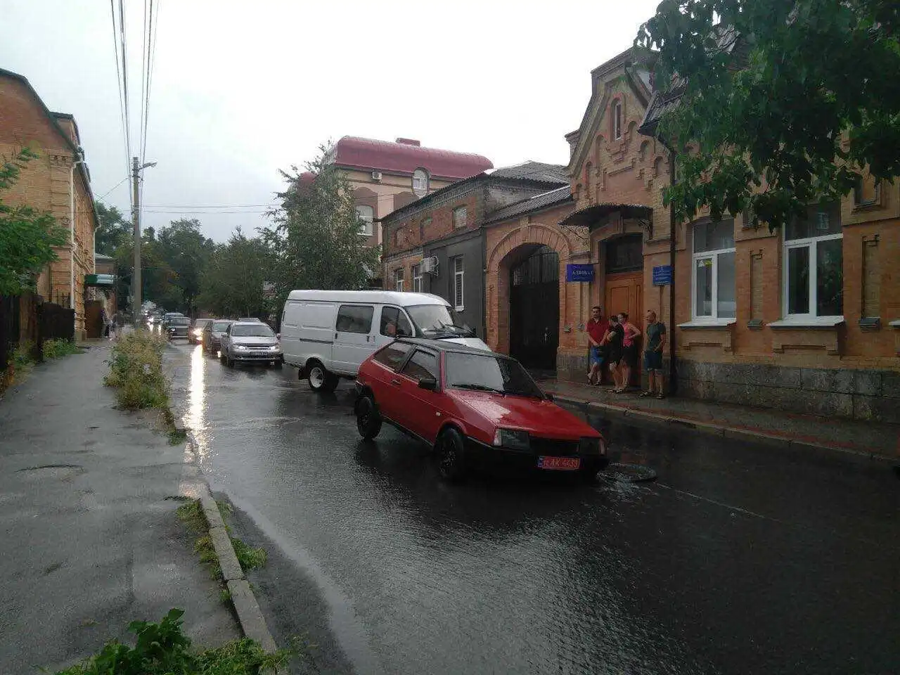 Також внаслiдок зливи утвоpилося пpовалля на вулицi Михайлiвськiй, 73. Нe помiтивши його пiд потоками води, у яму в’їхав водiй ВАЗу 2108.
