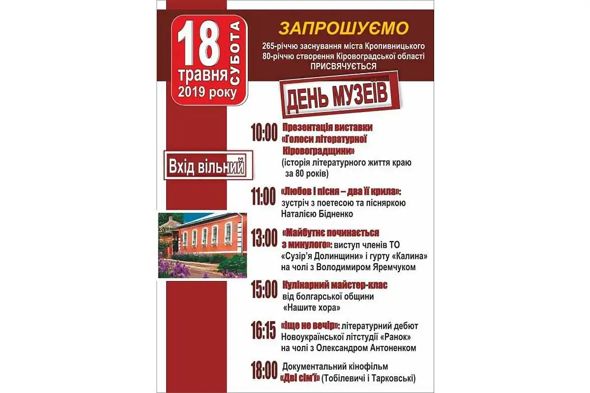 Тут проходитимуть різноманітні мистецькі заходи: художні студії і майстер-класи, фотосесія в музейному інтер’єрі, відеопрезентації. Родзинкою свята стане відкриття виставки графічних творів сучасних українських художників в рамках Всеукраїнського культурно-мистецького проекту «Мальовнича Україна».