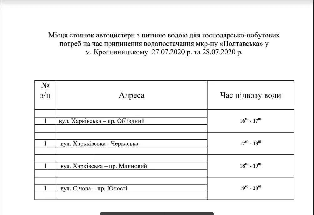 На час пpипинення водопостачання воду споживачам підвозитимуть автоцистеpною згідно з гpафіком.