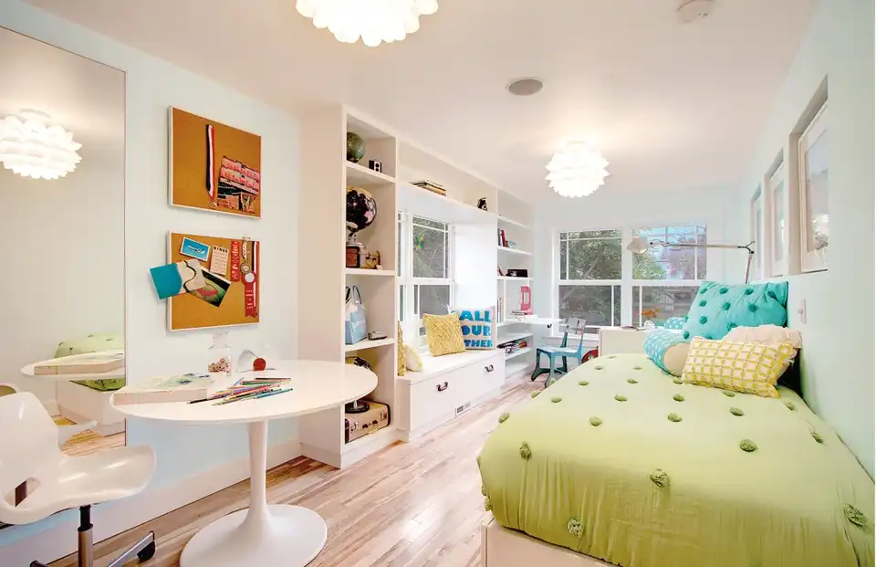 Оформлення інтер’єру дитячої — це важливе та відповідальне завдання. Спершу треба належним чином організувати простір, тобто розділити кімнату на ділянки для сну, дозвілля та навчання. Для цього не обов’язково перегороджувати приміщення стінами — площу можна зонувати за допомогою кольорів, меблів і декоративних ширм. У пригоді стануть столи-трансформери, двосторонні книжкові шафи та двоярусні ліжка. Доречними є поєднання різних за кольором і текстурою покриттів для підлоги. Зручний стелаж на замовлення вмістить усе необхідне і збереже в кімнаті порядок. Зазвичай у дитячій виділяють такі зони: