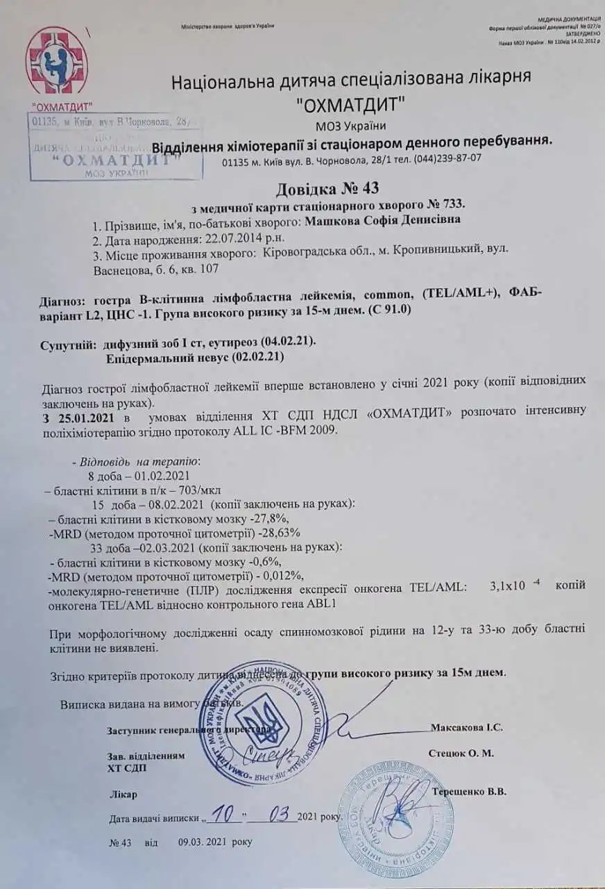 Після початку лікування у стан ремісії дівчинка увійшла лише на 33-й день. Зараз дитина продовжує хіміотерапію в столичному "ОХМАТДИТі".