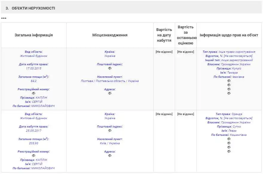 У 2017 Каплін задекларував 473 380 гривень доходів. З них - заробітна плата за роботу в парламенті становила 244,1 тисячі гривень, компенсація вартості оренди житла – 191,1 тисячі гривень, компенсація проїзду на території України – 38,2 тисячі гривень. Також за нардепом вказані фінансові зобов'язання в розмірі 99,1 тисячі гривень – виплата коштів за виконавчим листом.