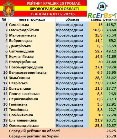 По Кіровоградській області Фонд оцінив 48 громад і склав рейтинг ТОП-20. У трійці лідерів – Смолінська, Олександрійська та Маловисківська громади.