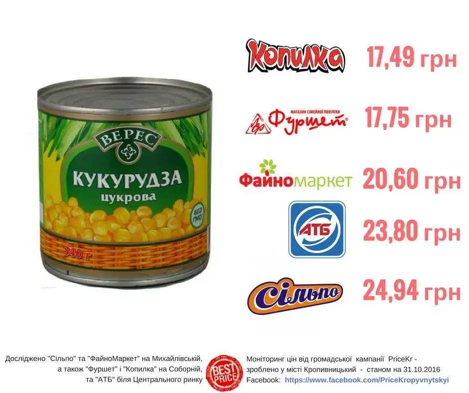 Експерти PriceKr продовжують проводити щоденний моніторинг цін на товари у супермаркетах Кропивницького. Предметом сьогоднішнього дослідження стала солодка консервована кукурудза.