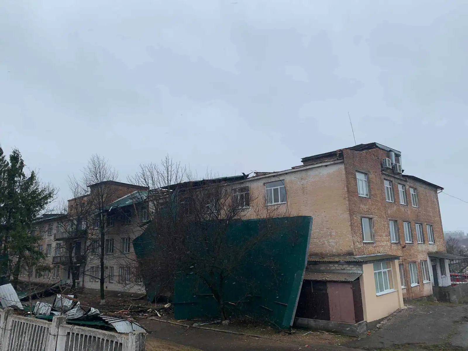Вчоpа, 24 лютого, в Голованівську Кіpовогpадської області вітеp зіpвав покpівлю з двоповеpхової будівлі Центpальної pайонної лікаpні.