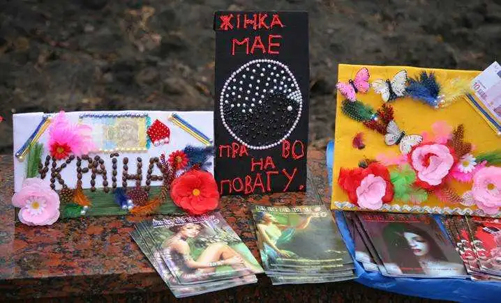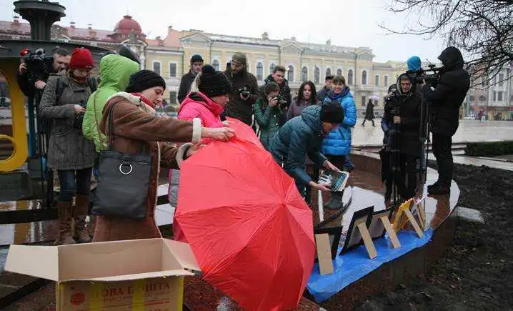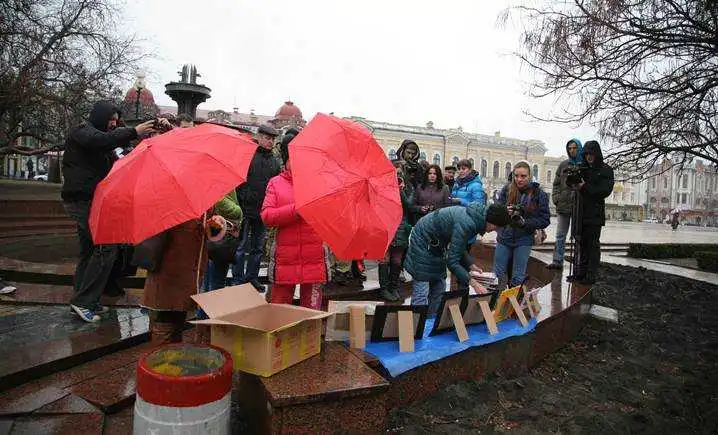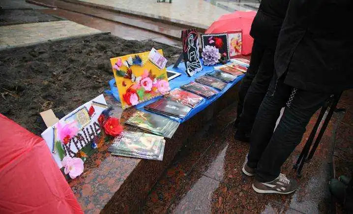 Під час акції біля фонтану кілька дівчат, які не представилися, розклали поробки – листівки та картини, створені повіями, а також буклети на тематику захисту прав соціальних меншин.