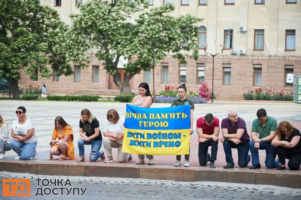 Провести захисників в останню путь до міськради та на площу Героїв Майдану прийшли сотні людей. Присутні тримали у руках прапори України.