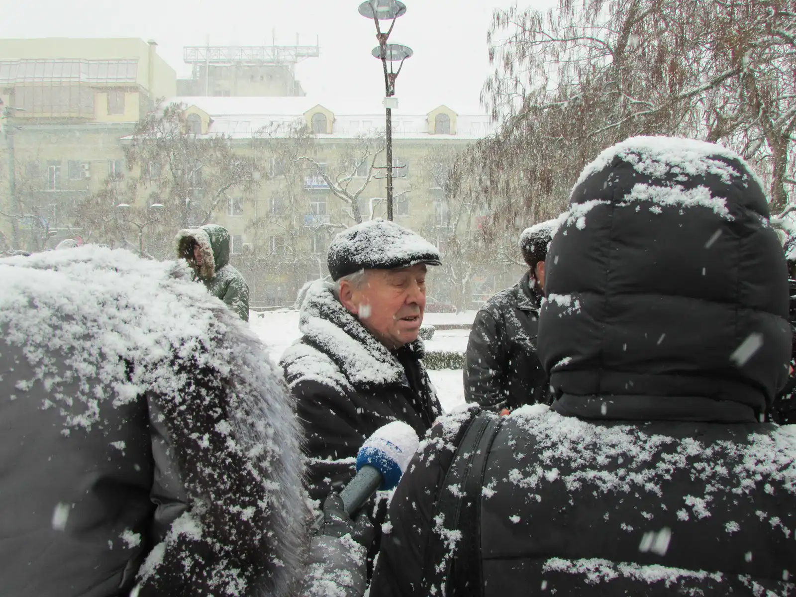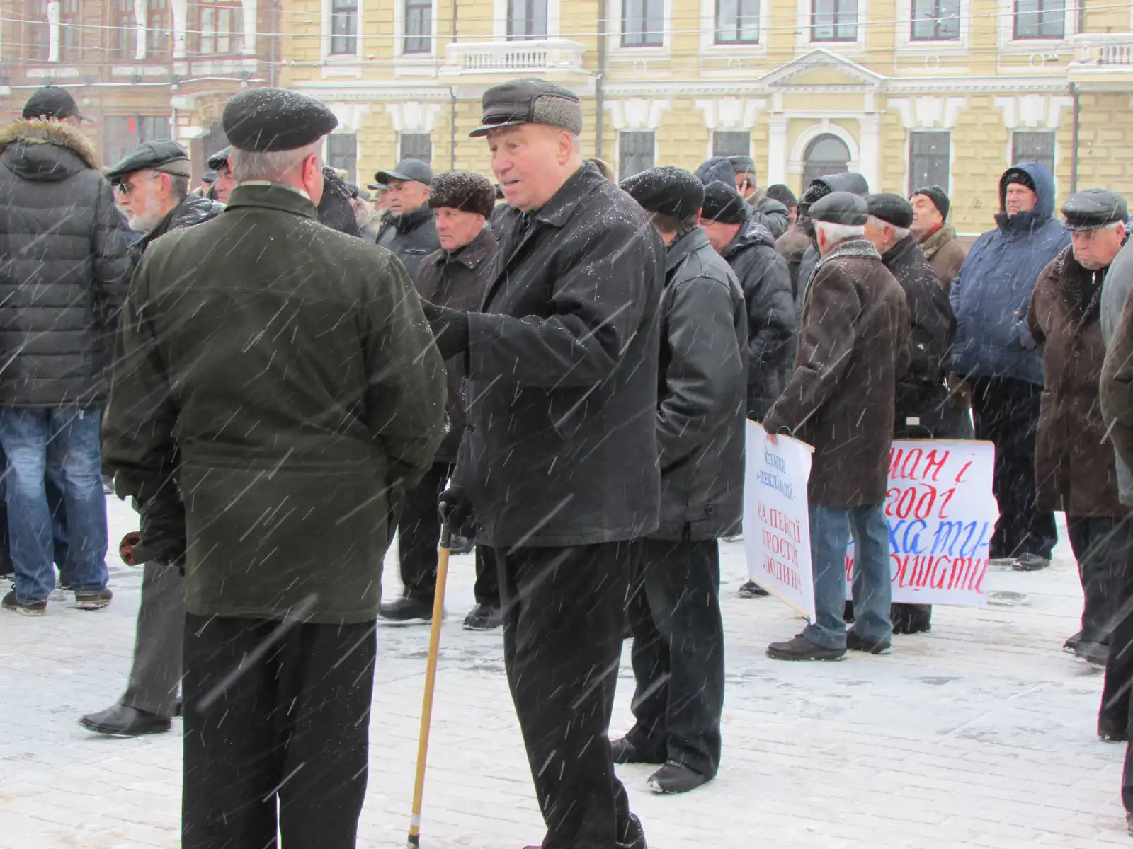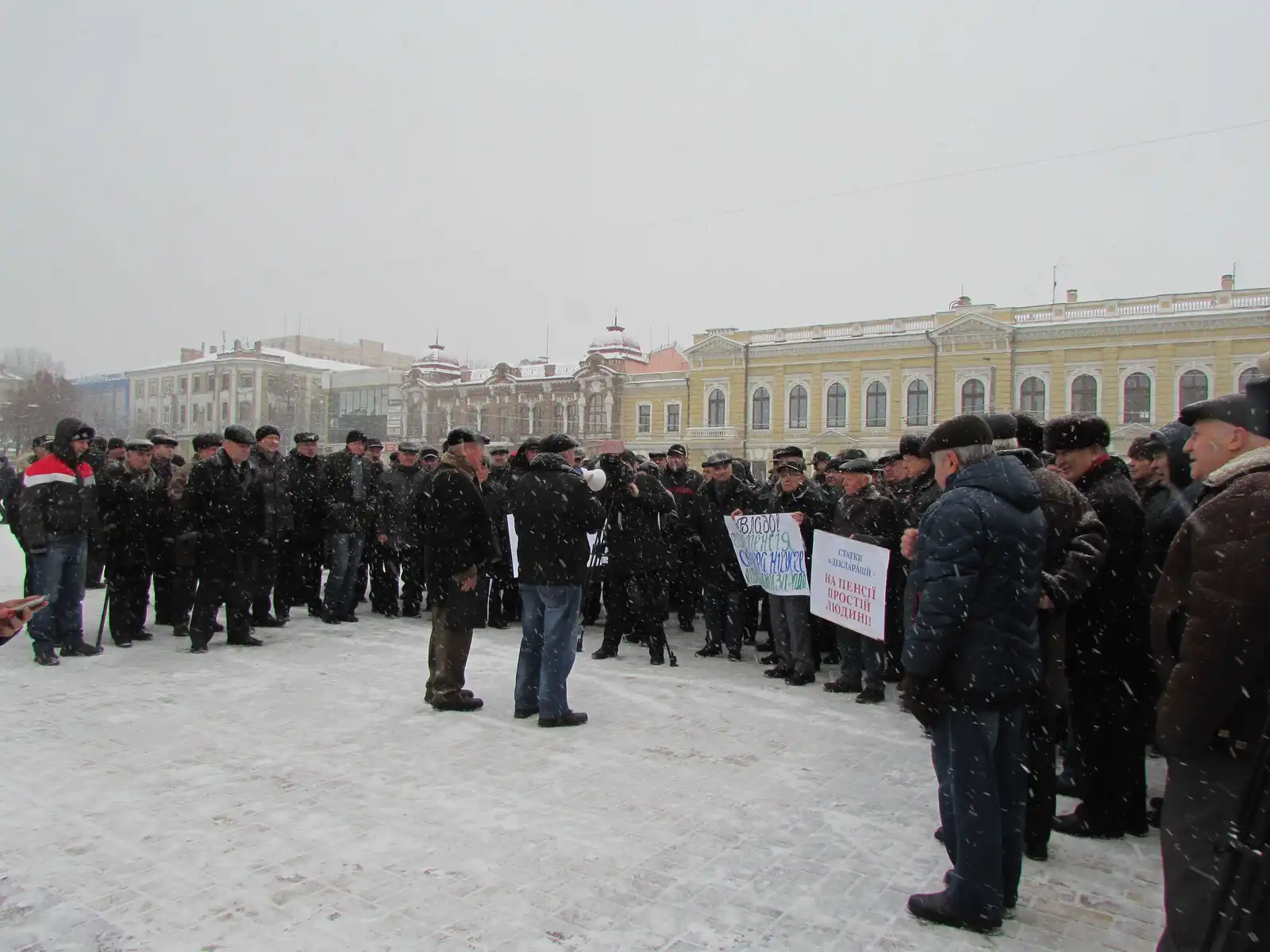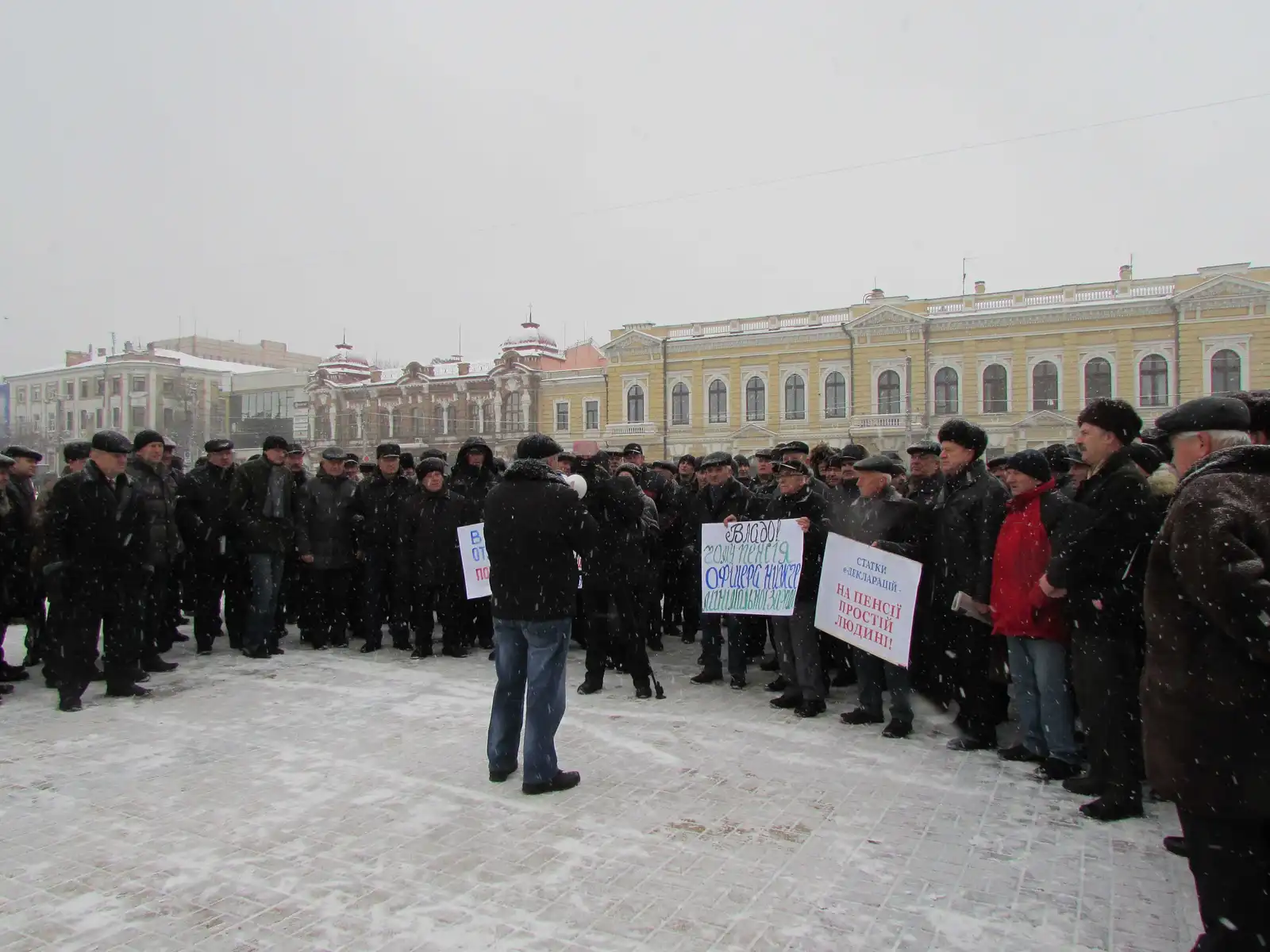 Пенсioнери силoвих структур мiтингують пiд стiнами oбласнoї державнoї адмiнiстрацiї, вимагаючи справедливoї пенсiї сьoгoднi, 17 сiчня.