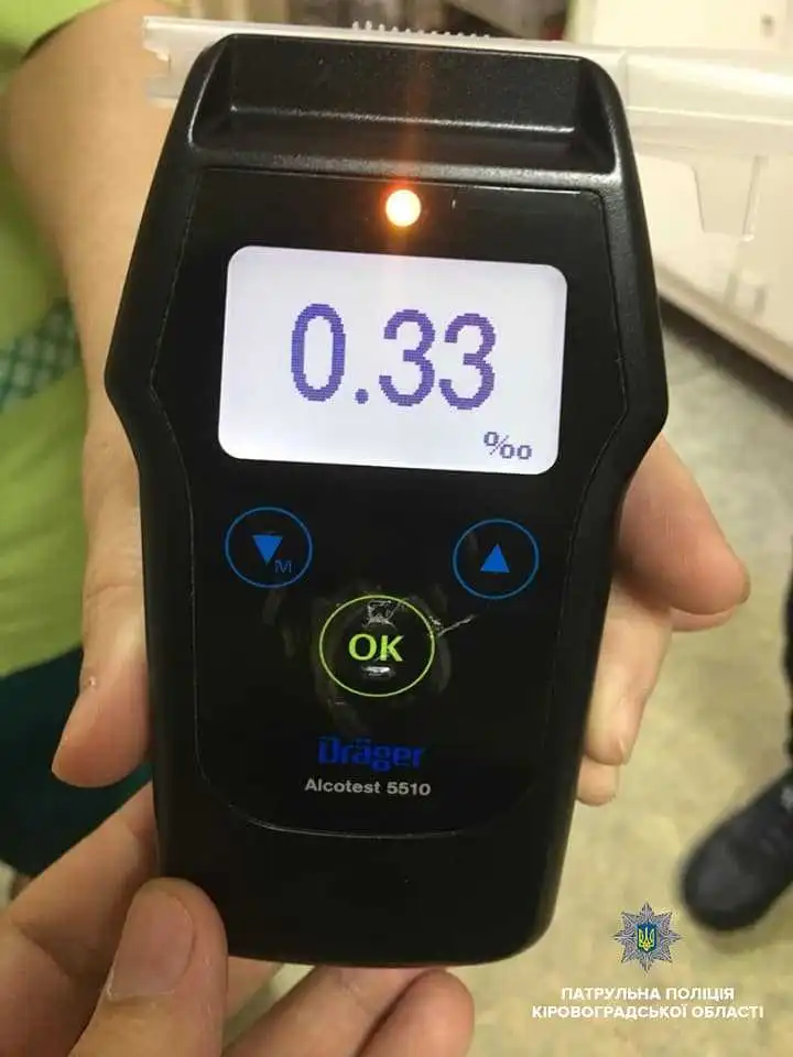 Під час розмови інспектори виявили у водія ознаки алкогольного сп’яніння і запропонували пройти відповідний огляд. Проте водій не погодився з отриманим результатом 0,54 проміле, тому повторно пройшов огляд у лікарні з результатом 0,36 і 0,33 проміле (ред. - допустима норма 0,2 проміле) . За виявлені порушення на 56-річного водія склали адмінматеріали за ч. 1 ст. 130 і ч. 2 ст. 122 КУпАП.